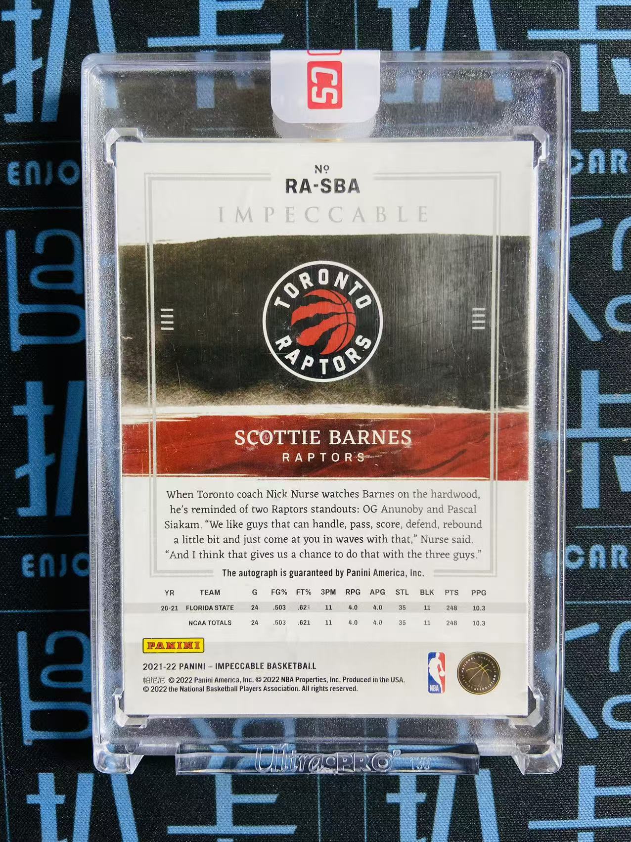 【扒卡拍卖】【拍前请看描述】2021-22 Panini Impeccable Scottie Barnes 小真金 斯科蒂 巴恩斯 猛龙 新秀RC 签字 卡签 /99编 板签 RA 交换换回 投资收藏必备 眼皮1131BK02