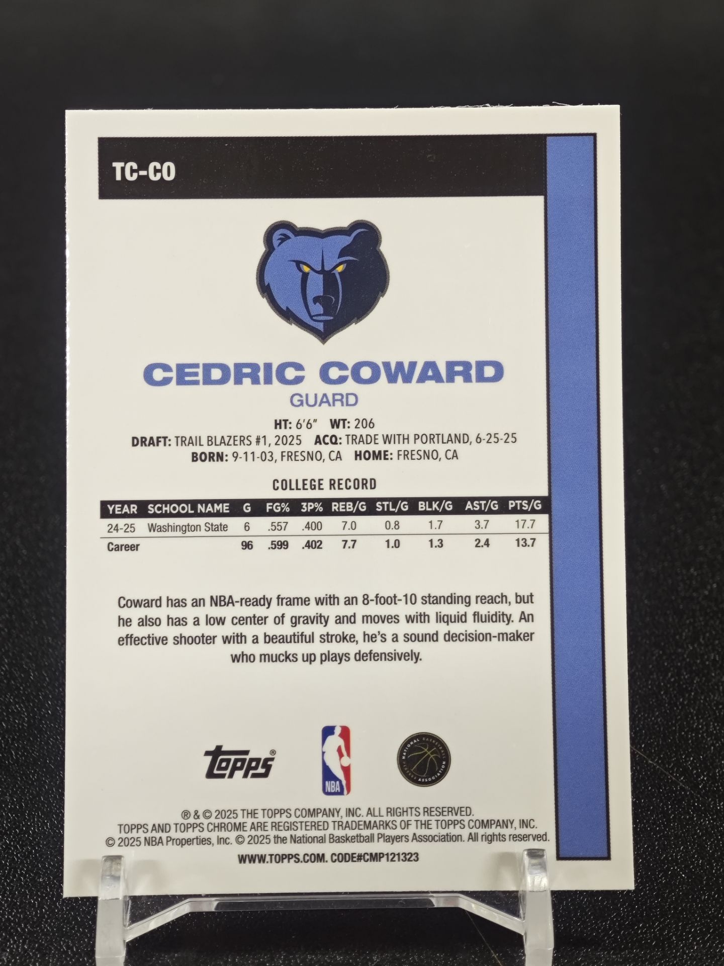 【浩行拍卖 截标预付82%】2025 topps Chrome cedric coward 灰熊 rc 新秀 塞德里克 考沃德 银mojo折 折射 45周年复古特卡 瑕疵看图 专收必备「屿川」1129S01單