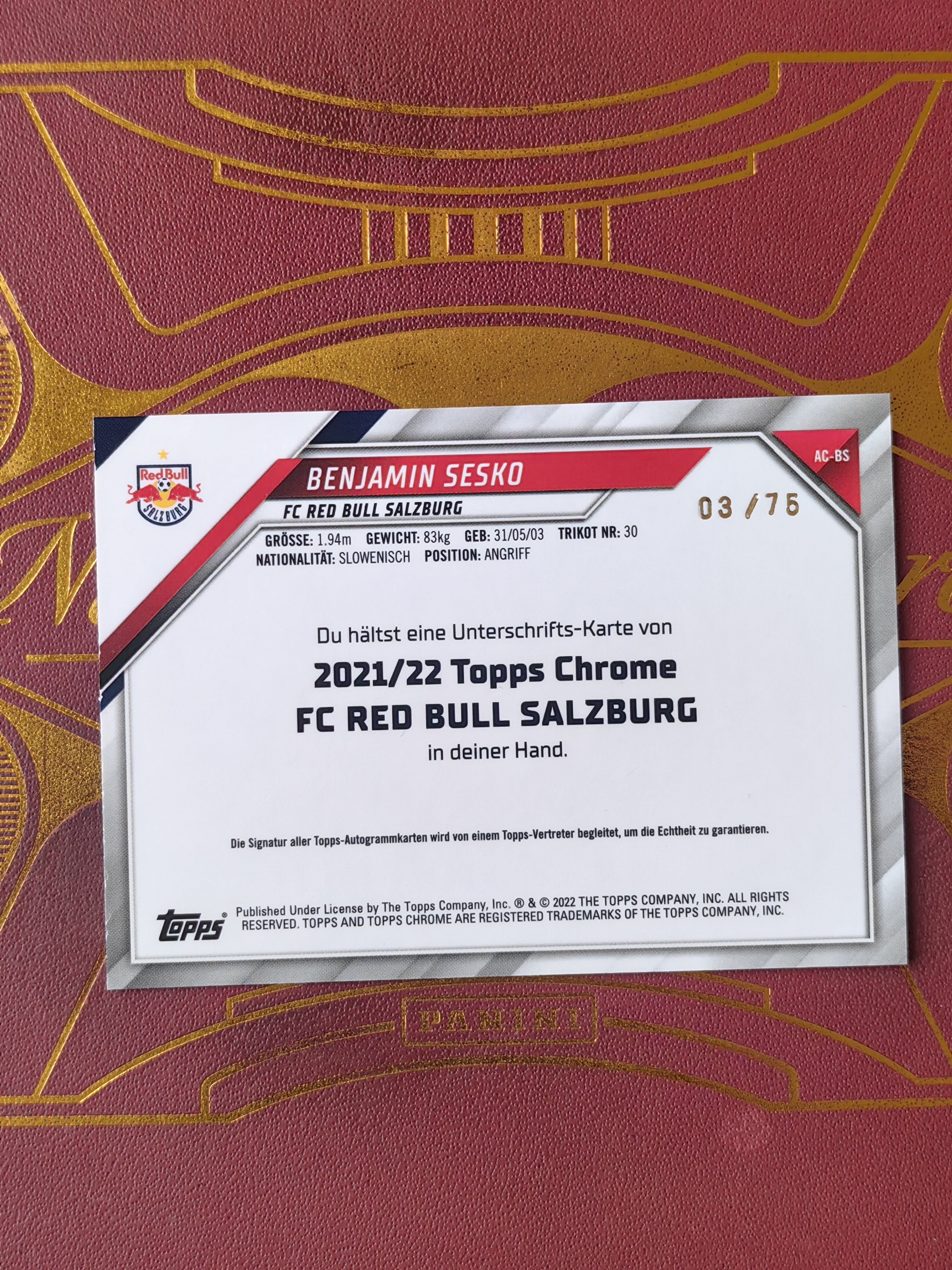 2021-22 Topps Chrome Benjamin Šeško RC 卡卡星球拍卖 TC 萨尔茨堡红牛队盒 塞斯科 赛思科 谢什科 新秀 RC 签字 卡签 背号签 3/75编 曼联 斯洛文尼亚