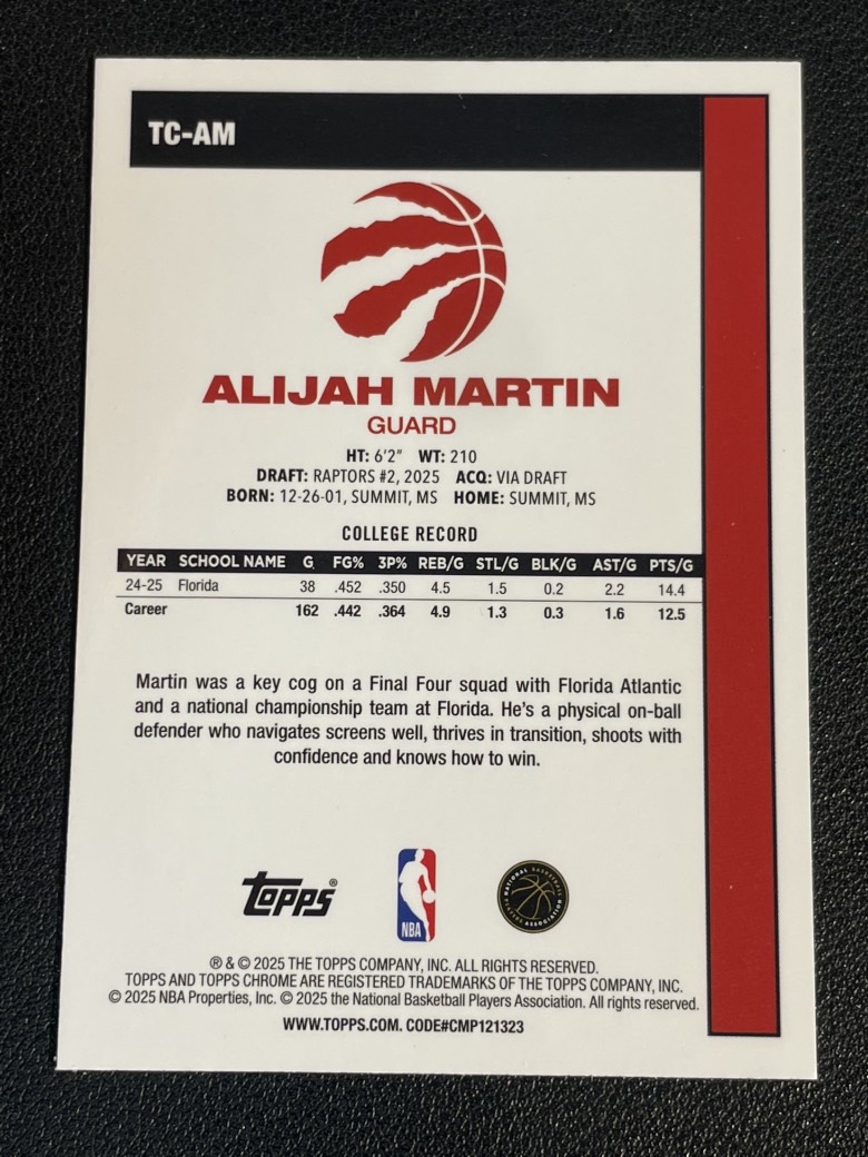 2025 Topps NBA Flagship Alijah Martin RC 437 阿莱贾 马丁 猛龙 新秀 1980复古 折射 银mojo折 卡品如图 pink