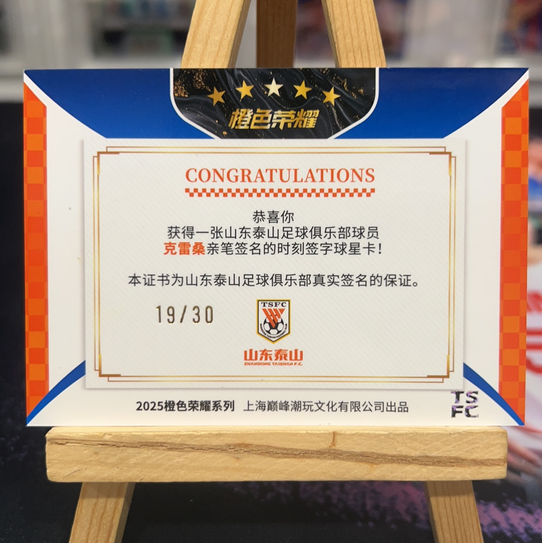 2025 巅峰潮玩 橙色荣耀 Cryzan 【耳朵卡社】巅峰潮玩 2025 山东泰山队盒 橙色荣耀 银折 时刻 签字卡 金笔 卡签 低编 19/30编 克雷桑 瑕疵见图 ling