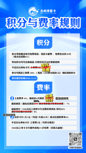 (2)付款:付款默认发货!竞拍成功后请于【卡淘新规3天内付款】,超过3天不付款必投诉封号!买卡皆为自愿出价,不要讲拍错了等情况!竞拍成功后不接受任何理由的弃标和发布点赔偿!所有拍品不支持直接上拍等其他后续服务。