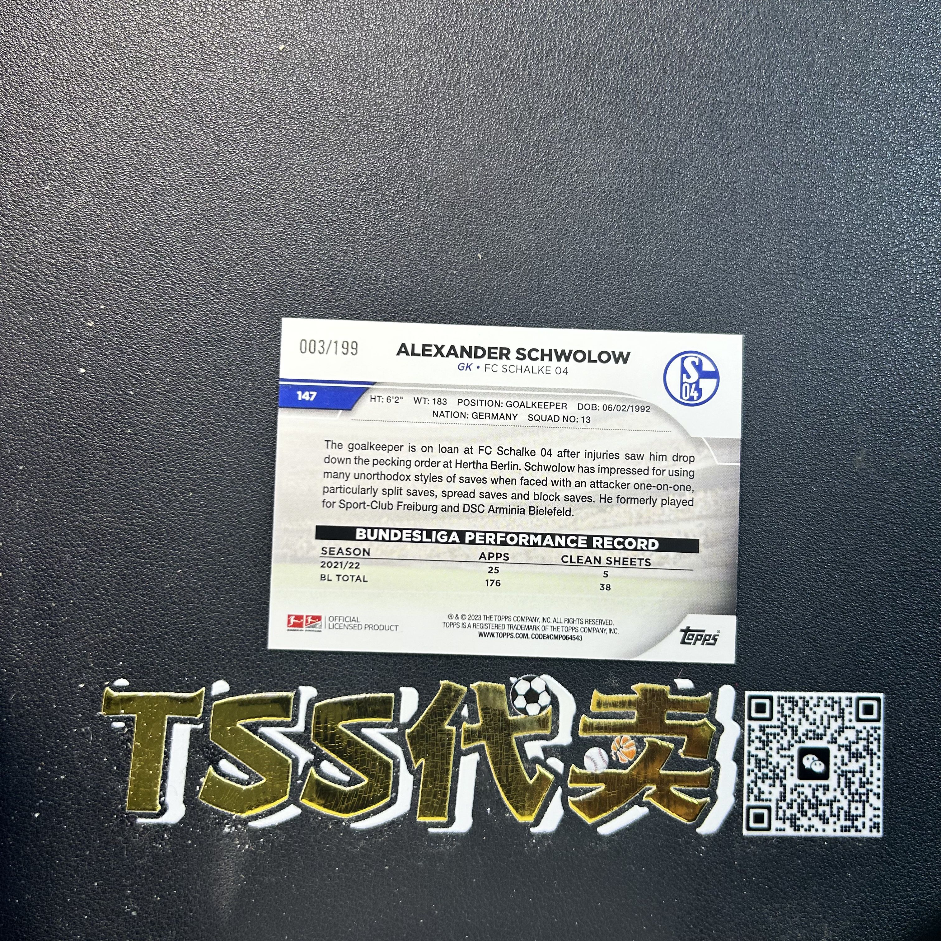 【TSS代卖-预付80%】2023 Topps Chrome 德甲碧玉 Alexander Schwolow 斯洛沃 柏林赫塔 /199编 新春折 YN6337 ZK57-陳
