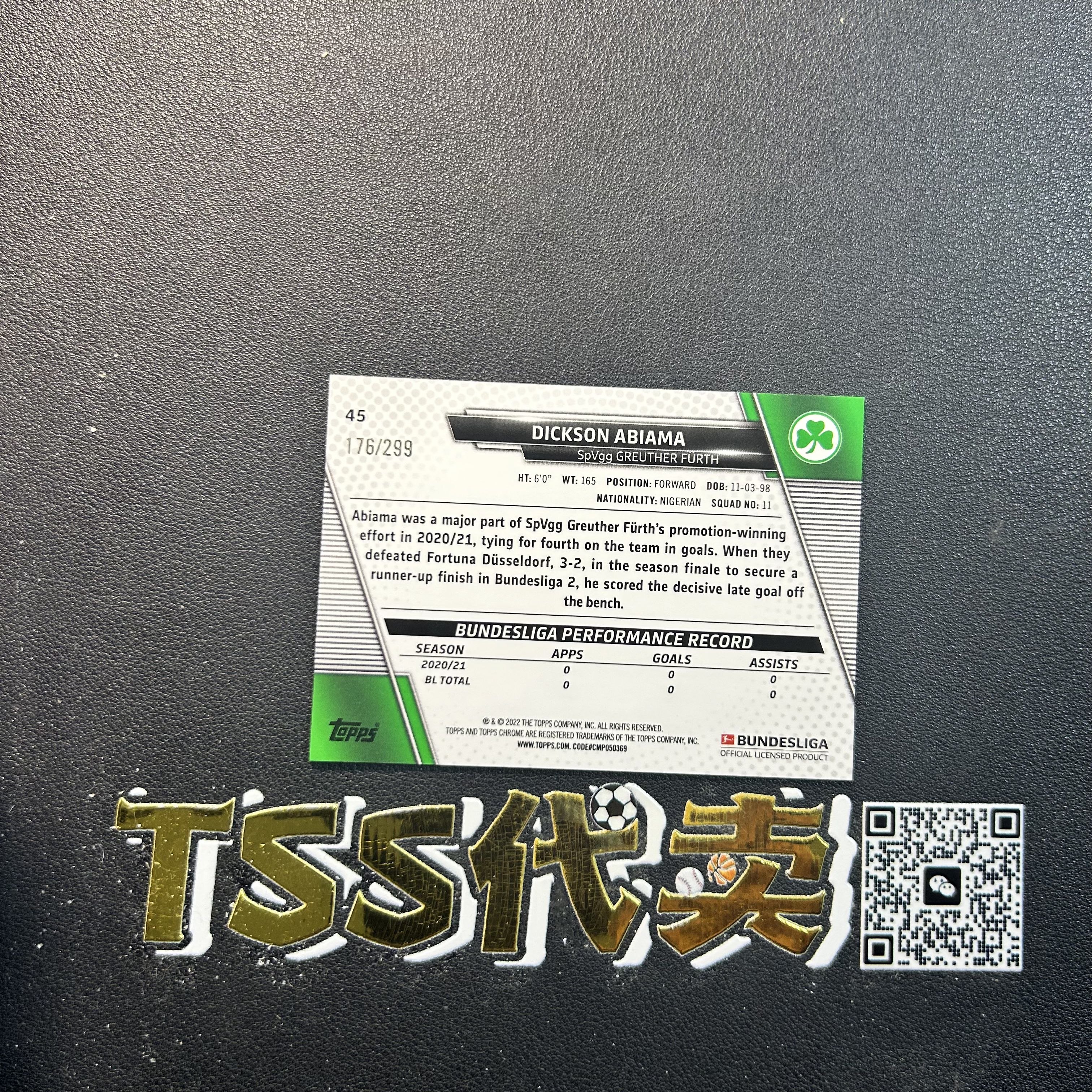 【TSS代卖-预付80%】2022 topps chrome 德甲Dickson Abiama RC 德甲 菲尔特 阿比亚马 299编 紫折 YN6337 ZK57-陳