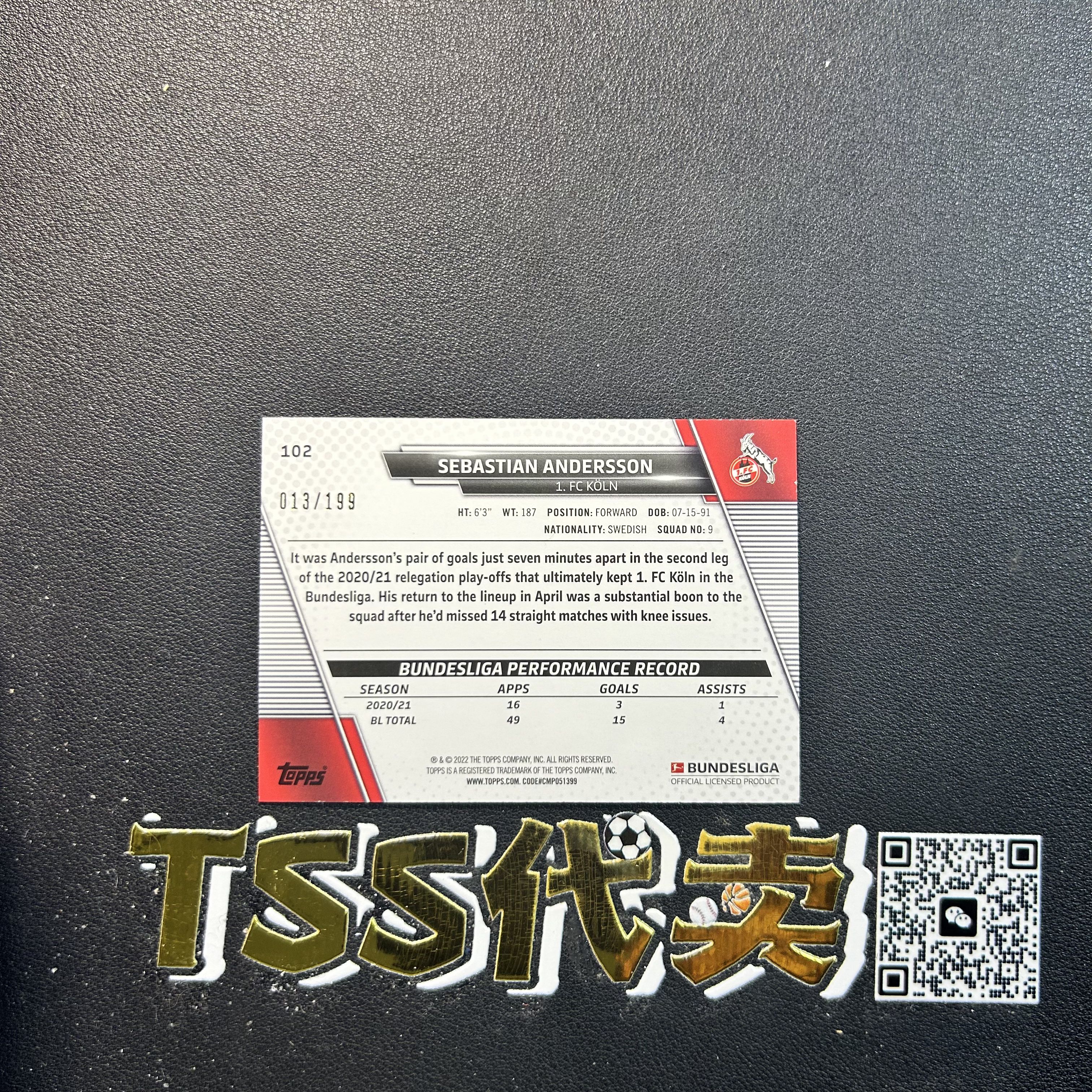 【TSS代卖-预付80%】2021-22 Topps UCC Sebastian Andersson 德甲 科隆 安德森 安德松 UCC /199编 YN6337 ZK57-陳
