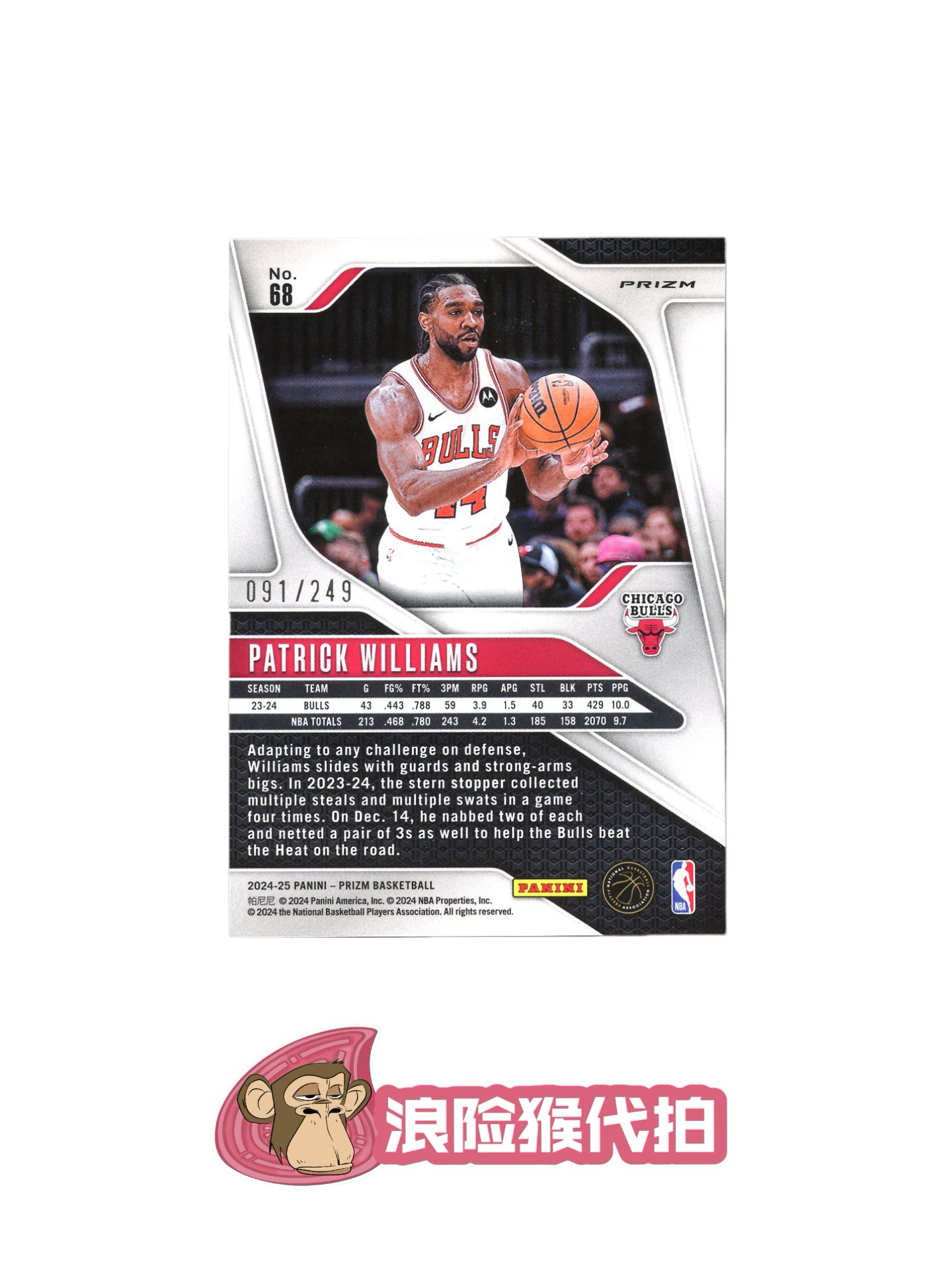 【浪险猴🐒代拍】2024-25 Panini Prizm Patrick Williams pz 帕特里克 威廉姆斯 折射 银瀑布折 带编 091/249编 卡品如图 黎明