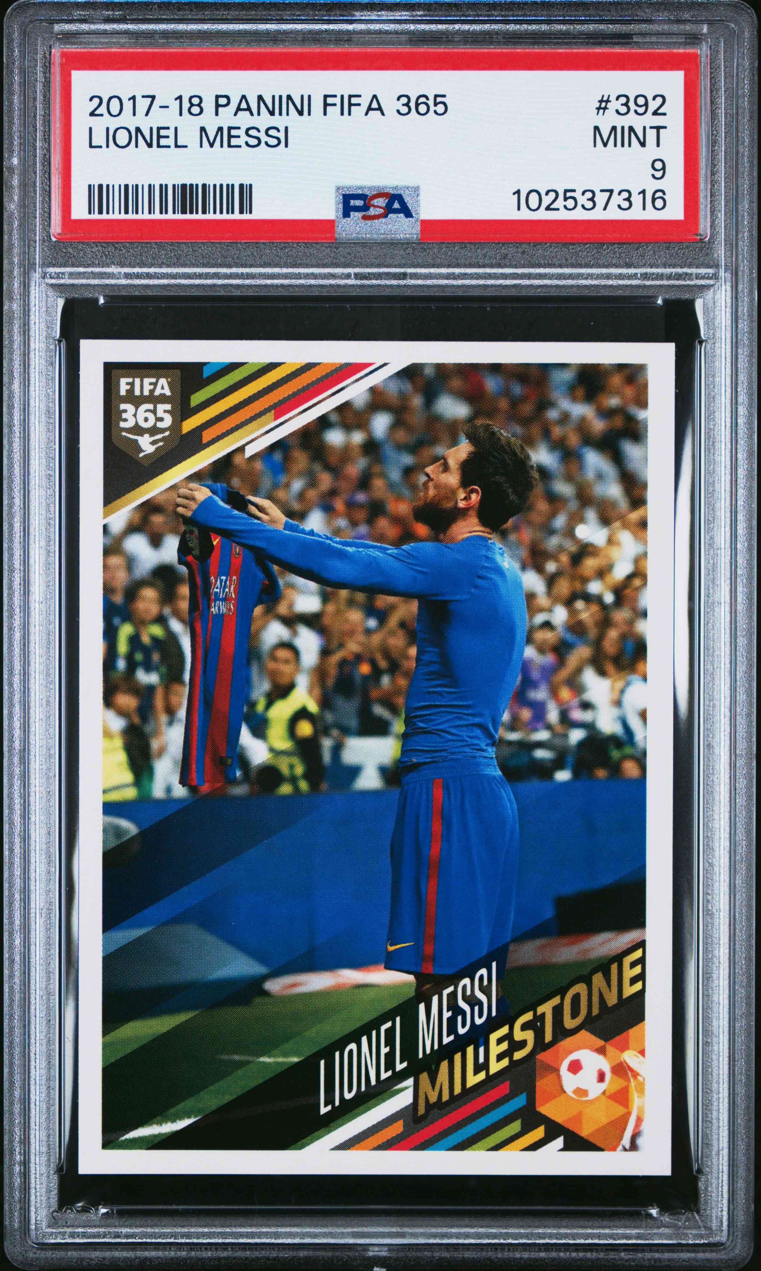 2017 Panini FIFA 365 Lionel Messi 欧冠 梅西 巴萨 举球衣 庆祝 阿根廷 球王 大巴黎 迈阿密国际 贴纸 PSA 9分 卡品如图