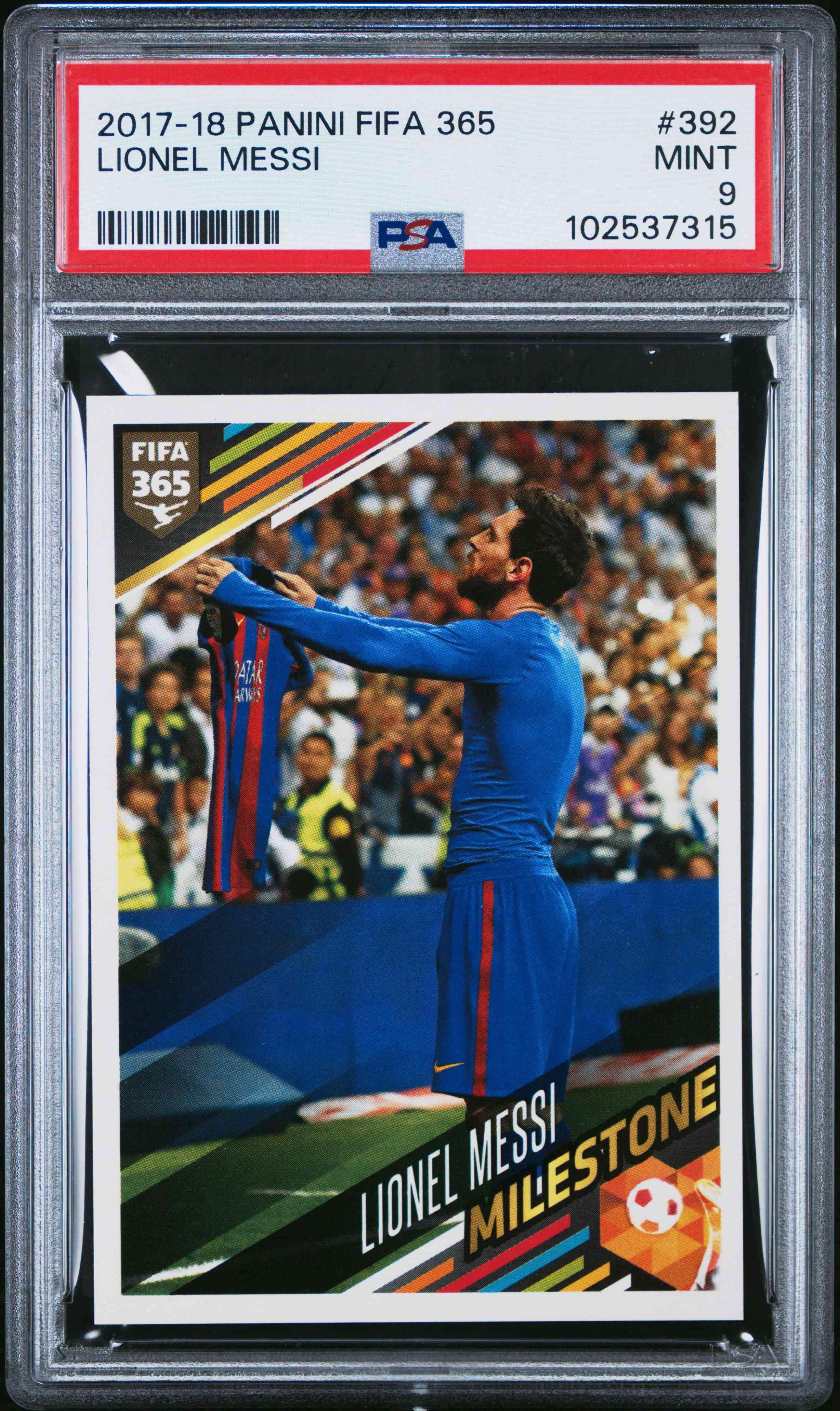 2017 Panini FIFA 365 Lionel Messi 欧冠 梅西 巴萨 举球衣 庆祝 阿根廷 球王 大巴黎 迈阿密国际 贴纸 PSA 9分 卡品如图 稀有 收藏必备