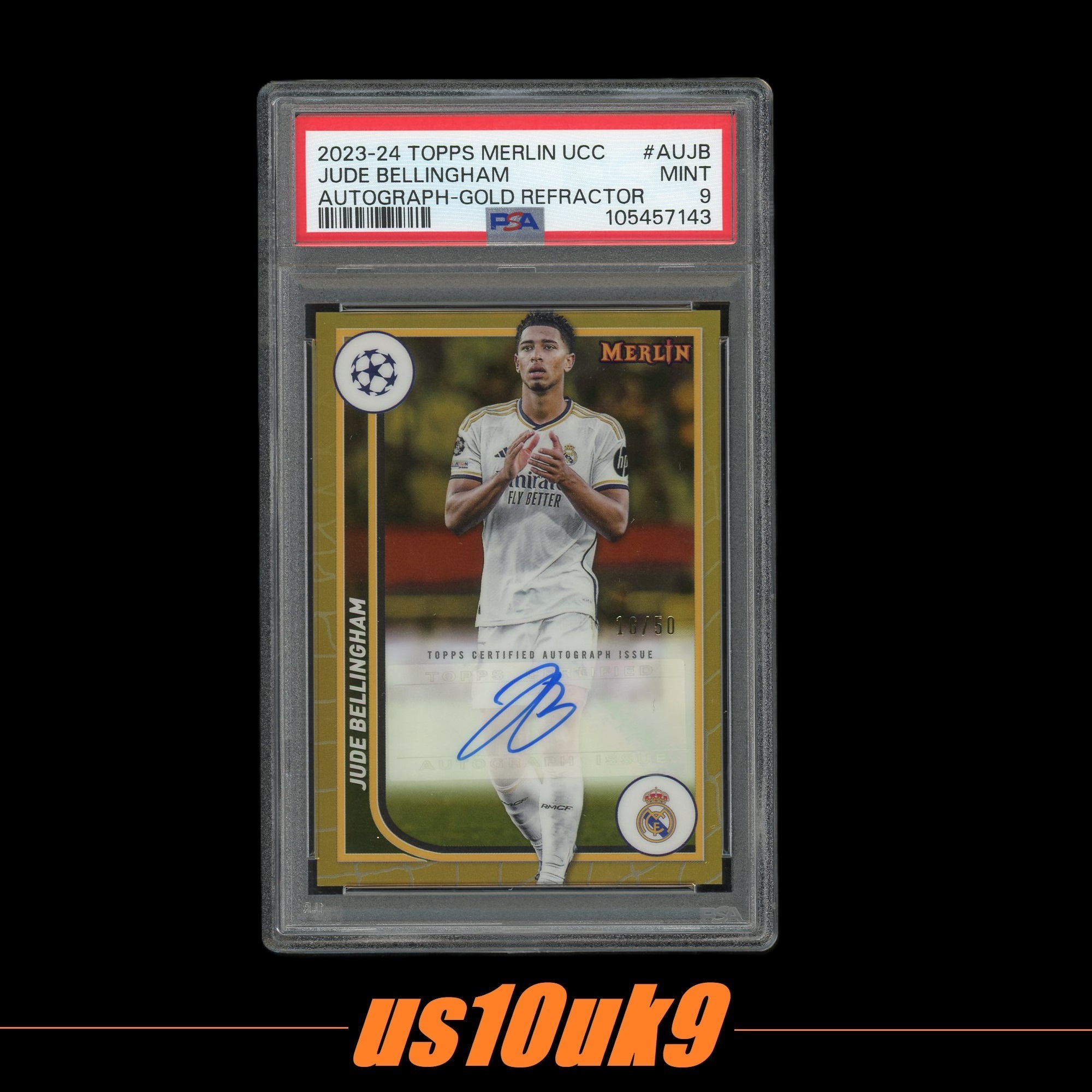 2024 Topps Merlin chrome Jude Bellingham 梅林欧战 贝林厄姆 折射签字 金折 多特蒙德 皇马 16/50编 PSA9分评级【US10-X694】