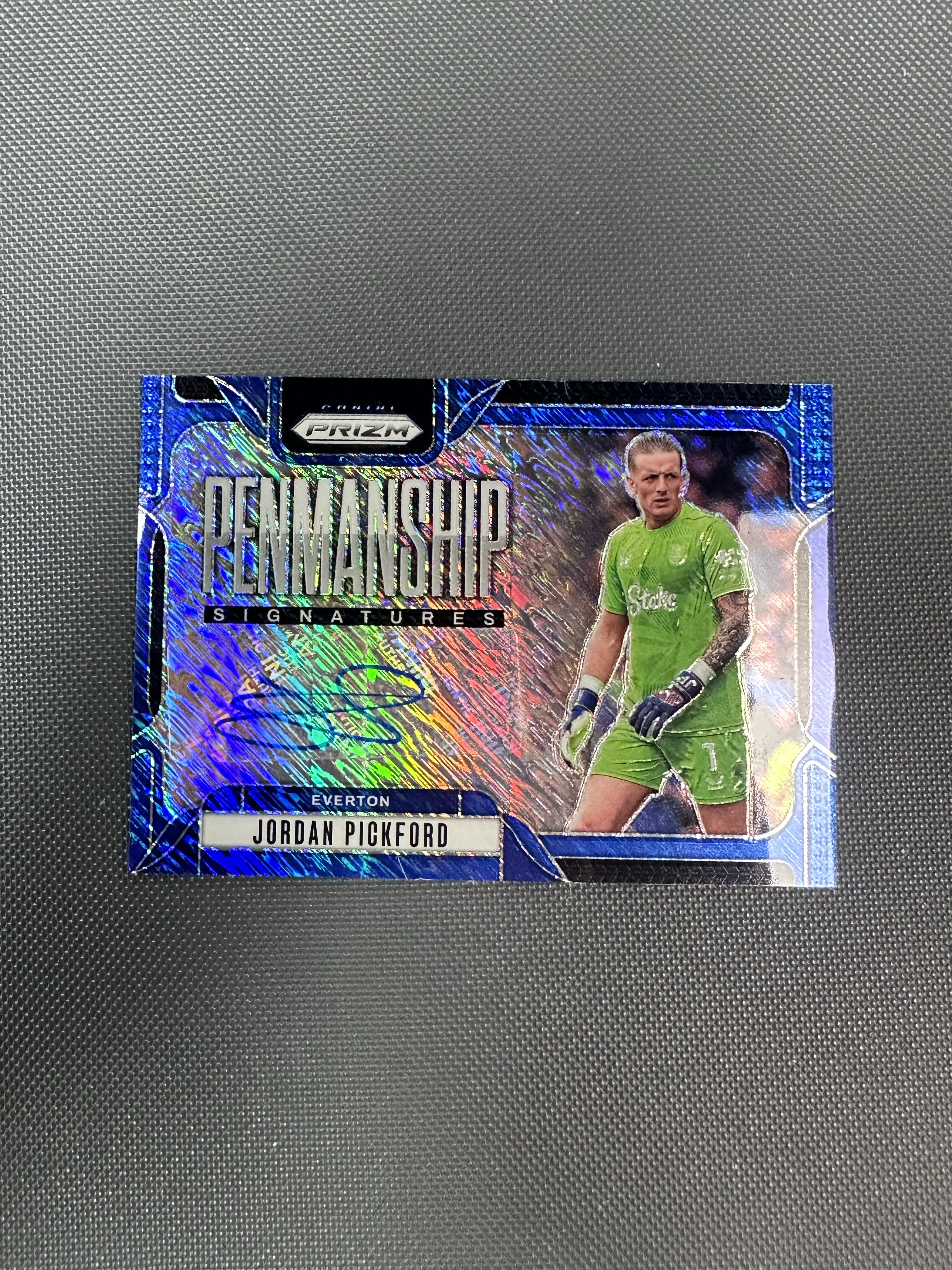 2024-25 Panini Prizm Jordan Pickford cu代卖cm 英超pz 皮克福德 埃弗顿 Penmanship 书法签 蓝shimmer折 微光折 折射 签字 卡品微瑕如图三