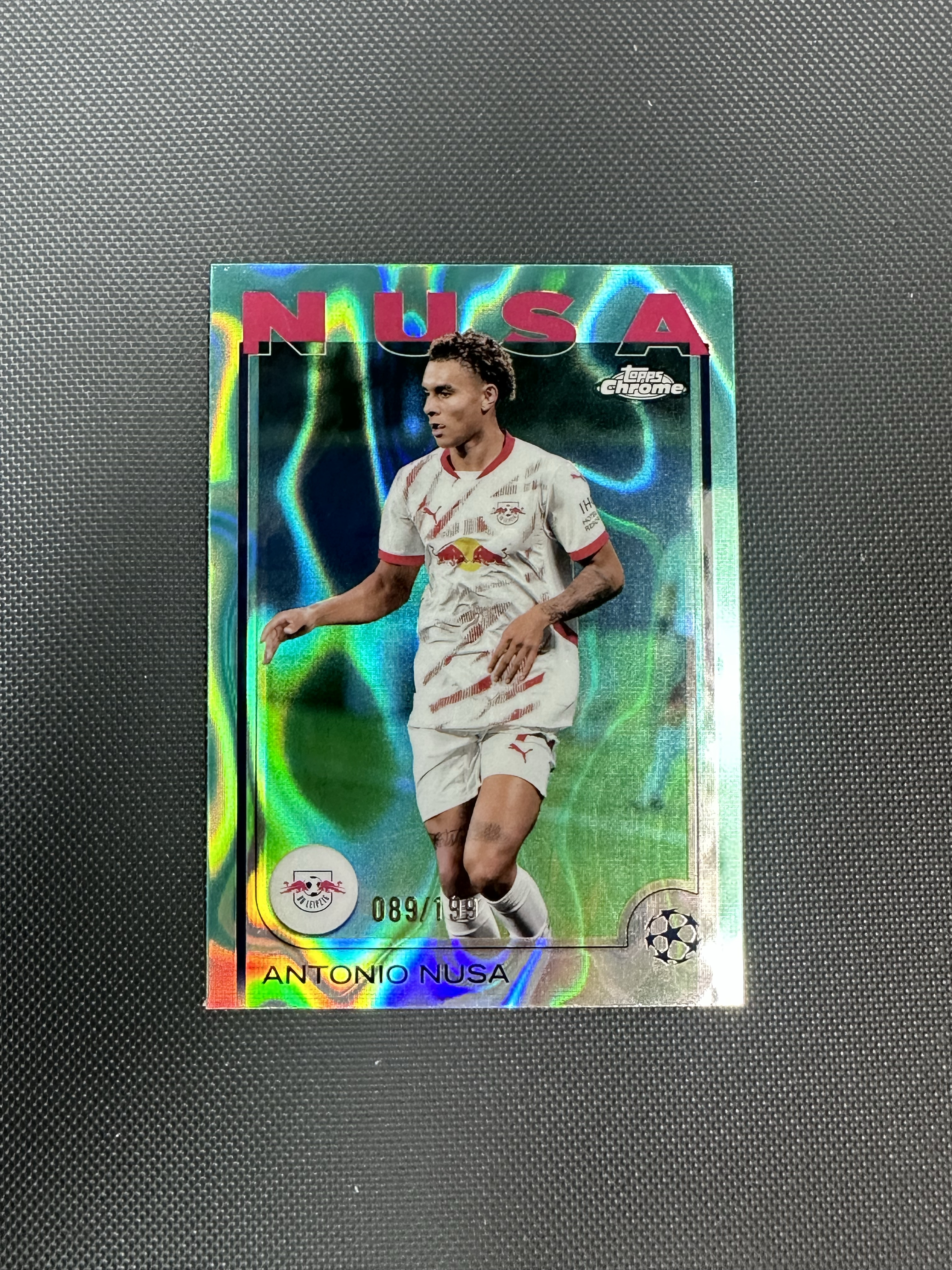 2024-25 Topps Chrome Antonio Nusa cu代卖cm 欧战 tc 安东尼奥 努萨 莱比锡红牛 挪威 089/199编 青熔岩折 水蓝折 折射 卡品细节如图三四