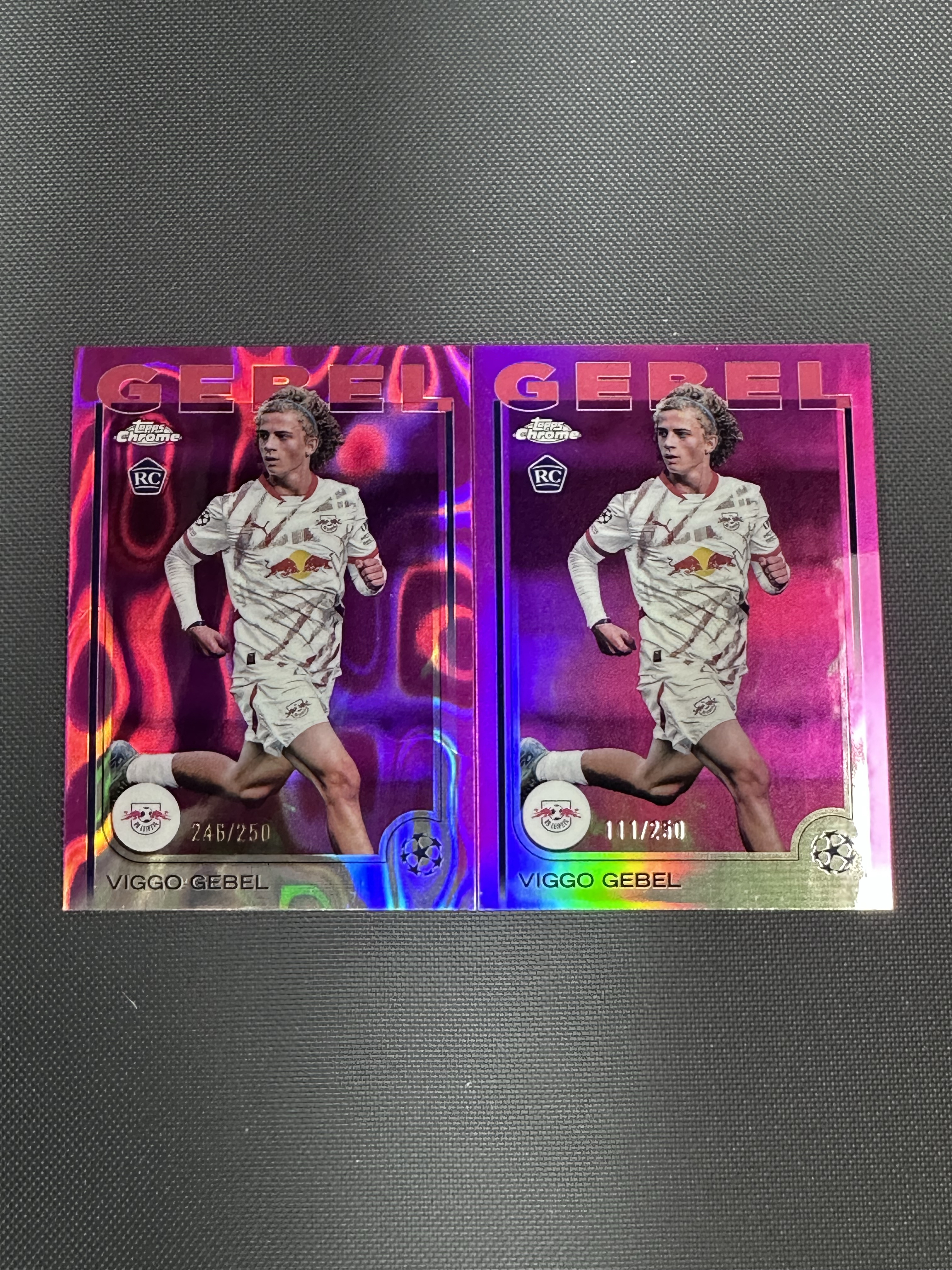 2024-25 Topps Chrome Viggo Gebel RC cu代卖cm 欧战Tc 维果 加贝尔 莱比锡红牛 德国 新秀 粉折 熔岩折 /250编 折射 两张打包 卡品细节如图三四