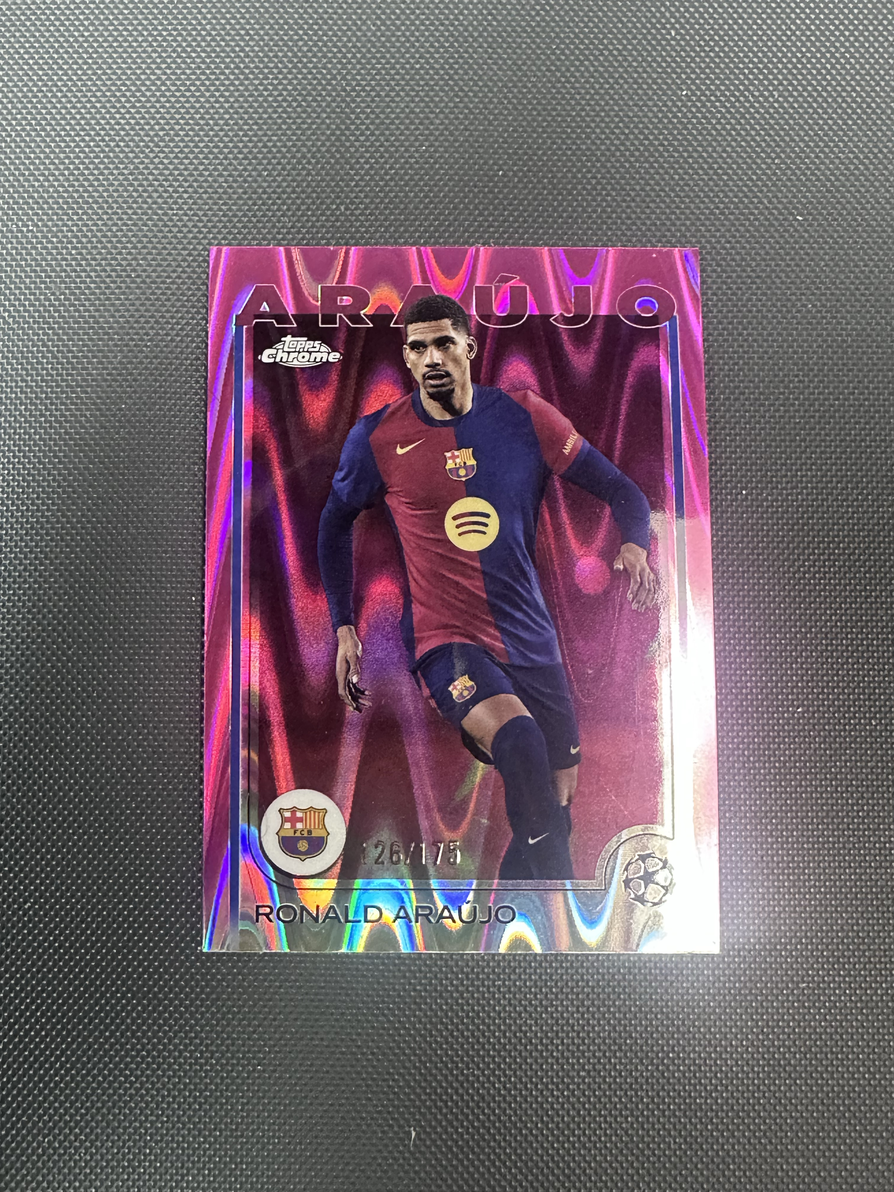 2024-25 Topps Chrome Ronald Araujo cu代卖燕子 欧战Tc 罗纳德 阿劳霍 巴萨 巴塞罗那 乌拉圭 126/175编 霓虹粉波纹折 亚马尔队友 折射 卡面细节如图三四