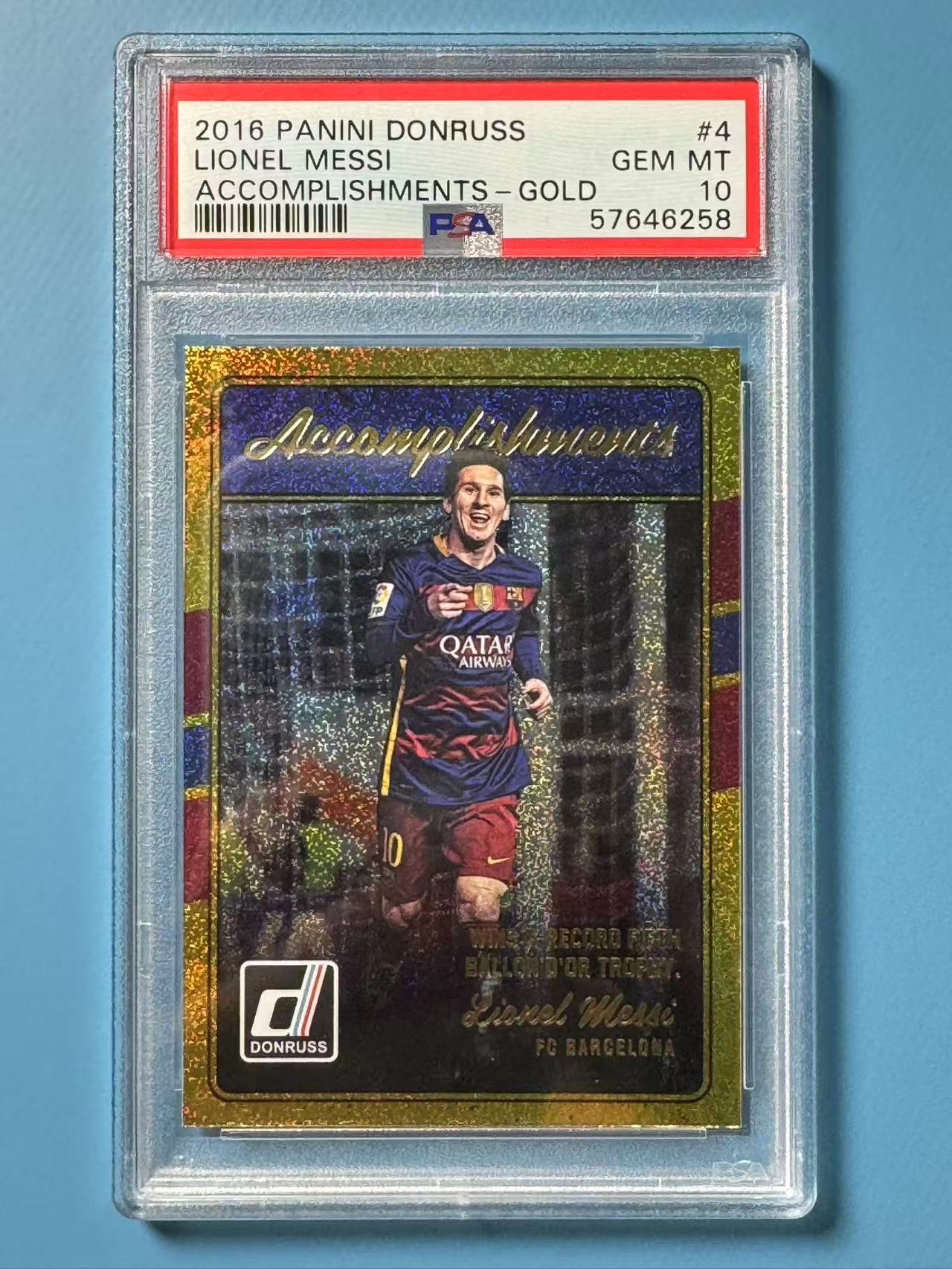 2016 Panini Donruss Lionel Messi 杜蕾斯 里奥 梅西 成就特卡 金闪折 评级卡 PSA 10 分 品相完美 卡品如图