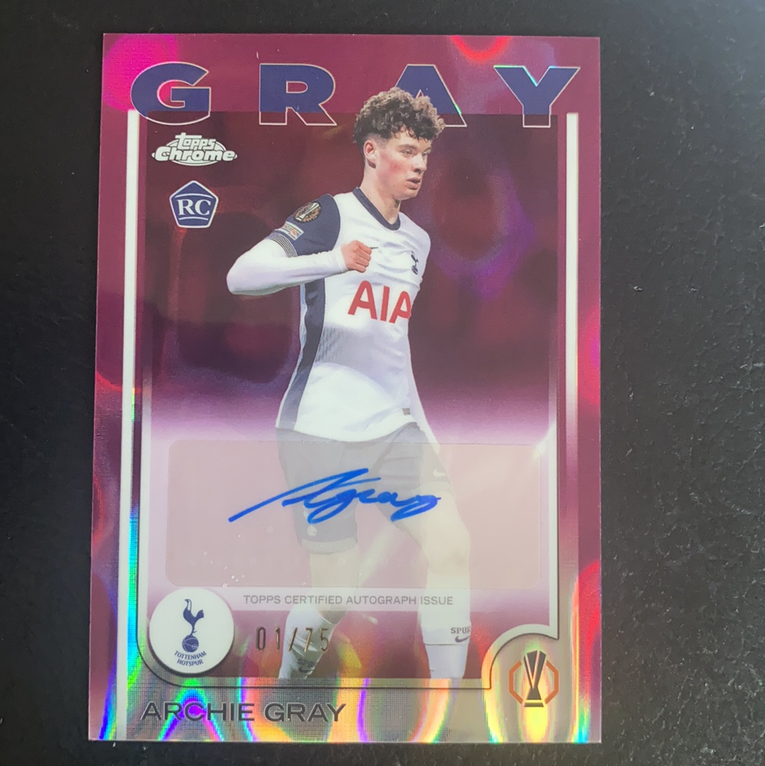 阿奇格雷 01/75 首编 粉折 rc 新秀 签字 大热新秀 热刺 欧联杯冠军 Archie Gray 2024-25 Topps Chrome 细节如图 法国超跑
