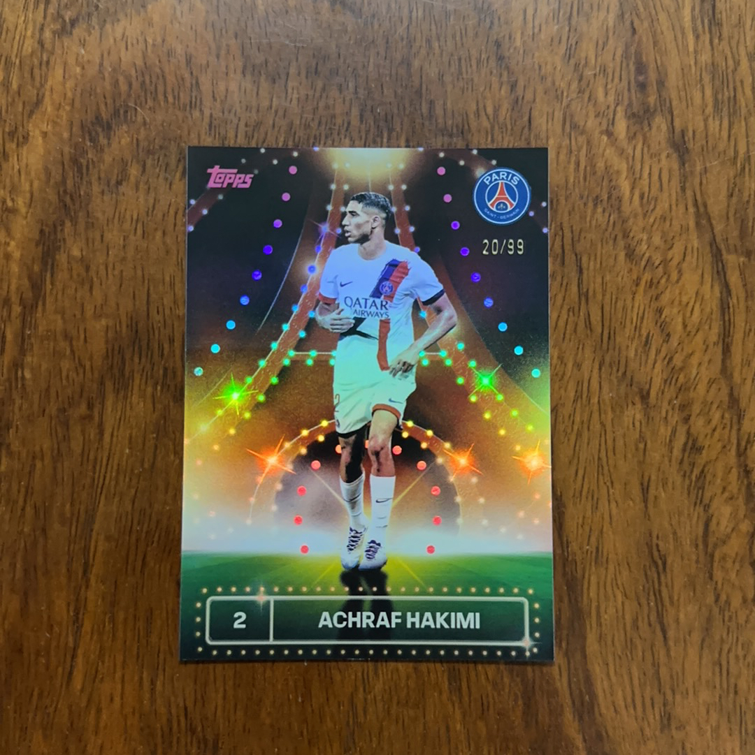 2025 Topps 巴黎队盒 Achraf Hakimi 阿什拉夫 哈基米 摩洛哥 巴黎圣日耳曼 大巴黎队盒 20/99编 紫折 折射 巴黎人表演特卡 卡品如图