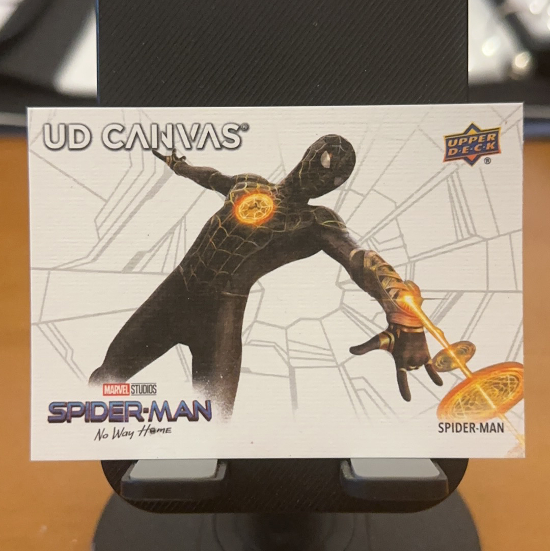 2023 UD漫威蜘蛛侠英雄无归 画布特卡,品相完好。卡面设计精美,蜘蛛侠经典造型,蓝色背景搭配金色装饰,立体感强。卡背故事描述清晰,收藏价值高。所见即所得