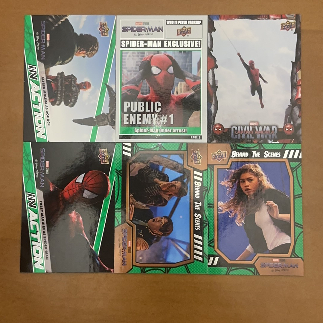 Upper Deck蜘蛛侠英雄无归收藏卡,包含幕后特卡和角色卡,品相完好!有蜘蛛侠、玛丽简、绿魔等经典角色,都是正版官方卡。