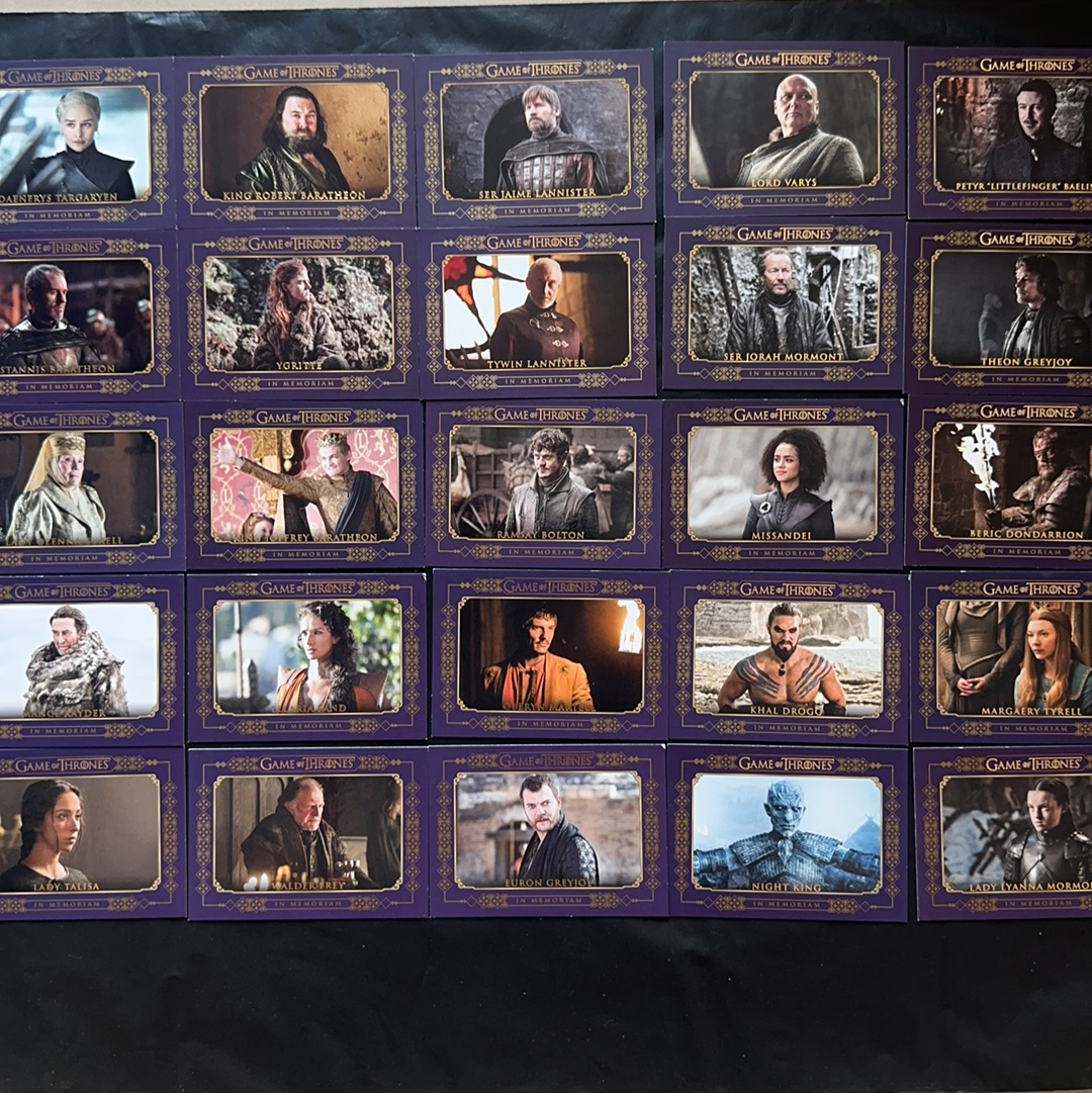 权力的游戏最终季限量紫色收藏卡,品相完好。 每张都是紫色背景,金色边框,画面清晰,收藏价值高。25张不重复,所见即所得 卡品如图