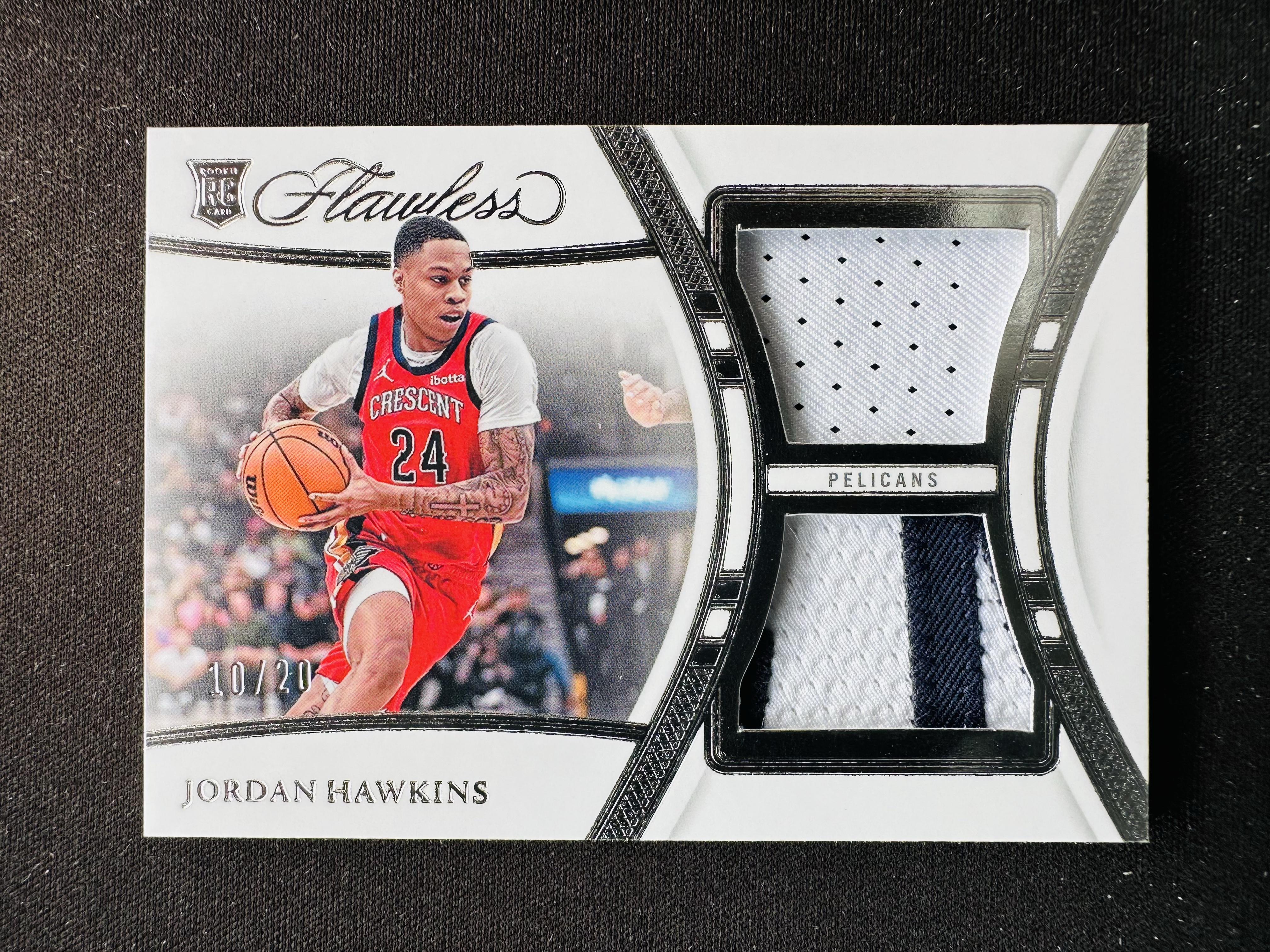 【业勋】panini23-24NBA手提Flawless乔丹霍金斯Jordan Hawkins鹈鹕队RC新秀RC银折 双色双窗球衣物料切割 亲笔卡签字签名10/20编 细节见图!pp