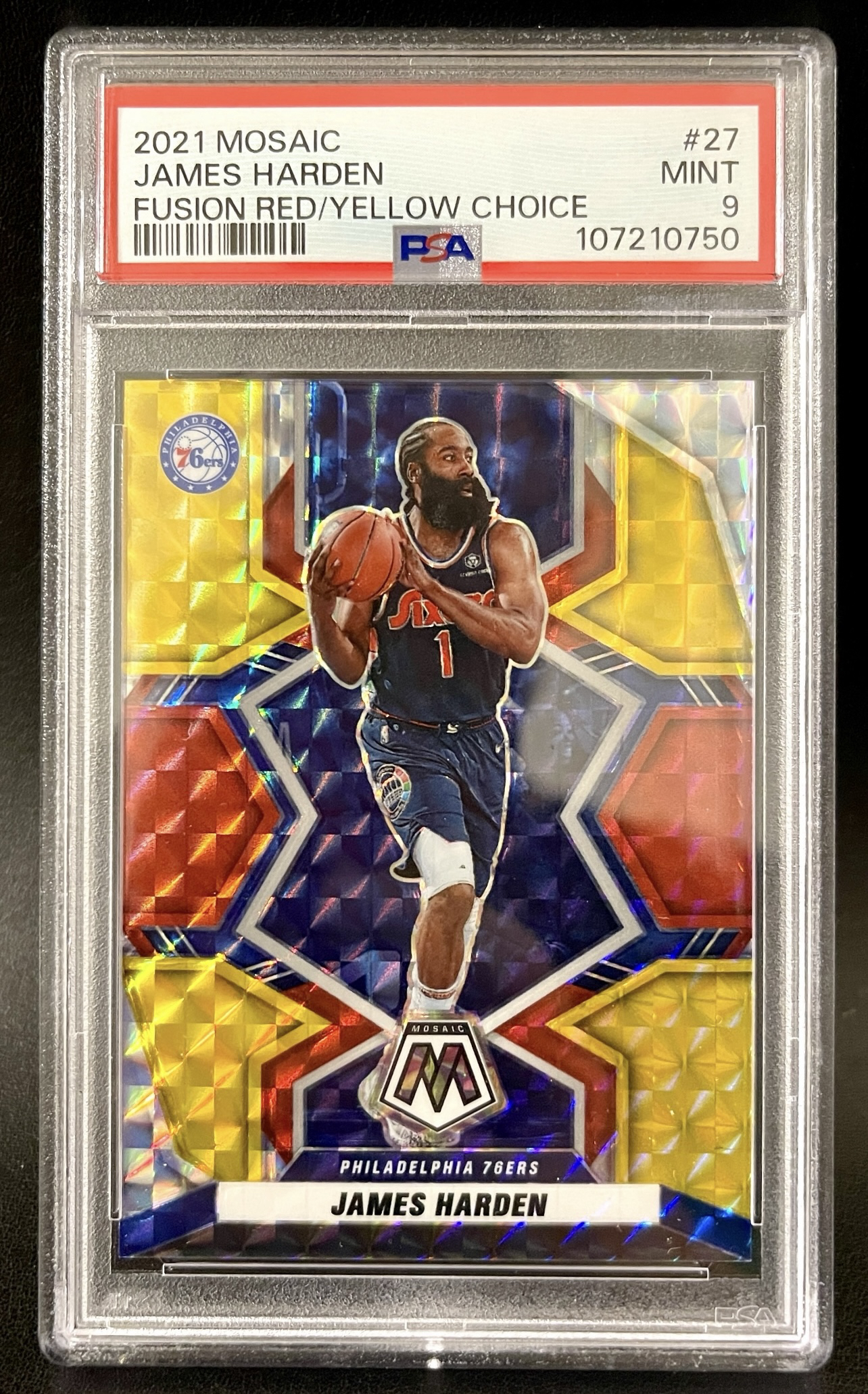詹姆斯哈登 大胡子 2021-22 Panini 马赛克 31/88编 红黄折 折射非常漂亮 PSA9分评级卡 76人 快船 75大巨星 值得收藏!
