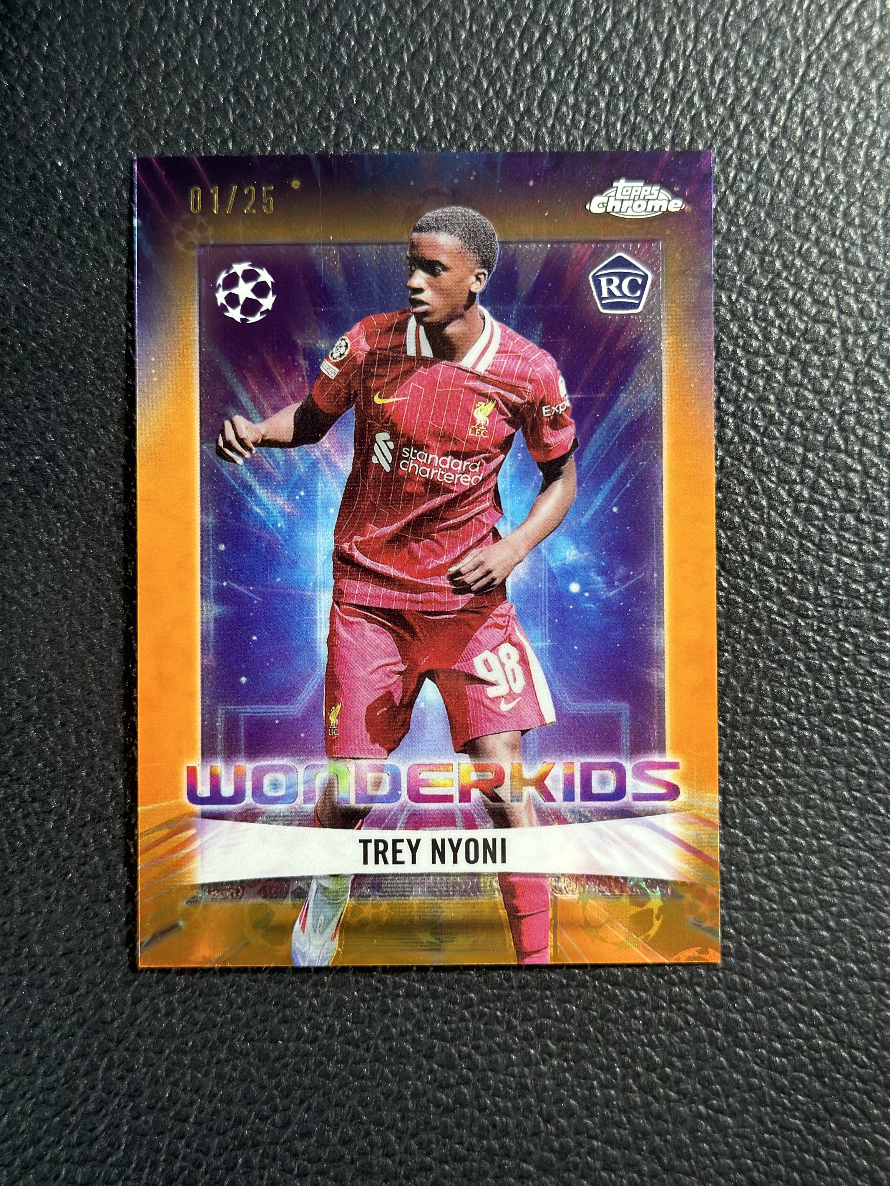 2024-25 Topps Chrome Trey Nyoni RC Kacey拍卖最新欧冠TC 英格兰利物浦超新星中场 尼奥尼 1/25首编橙折正新秀 收藏必备蜜柑卡品如图