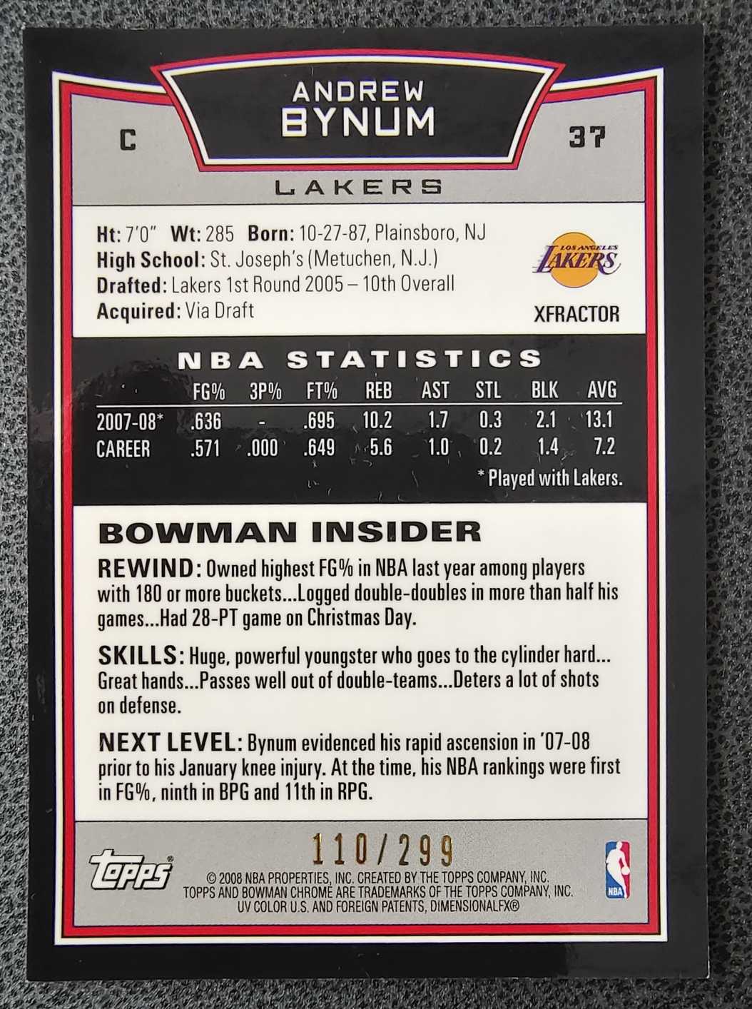 2008-09 Topps Chrome Andrew Bynum 安德鲁 拜纳姆 洛杉矶 湖人队 黑格子折 110/299 老卡 凑套必备