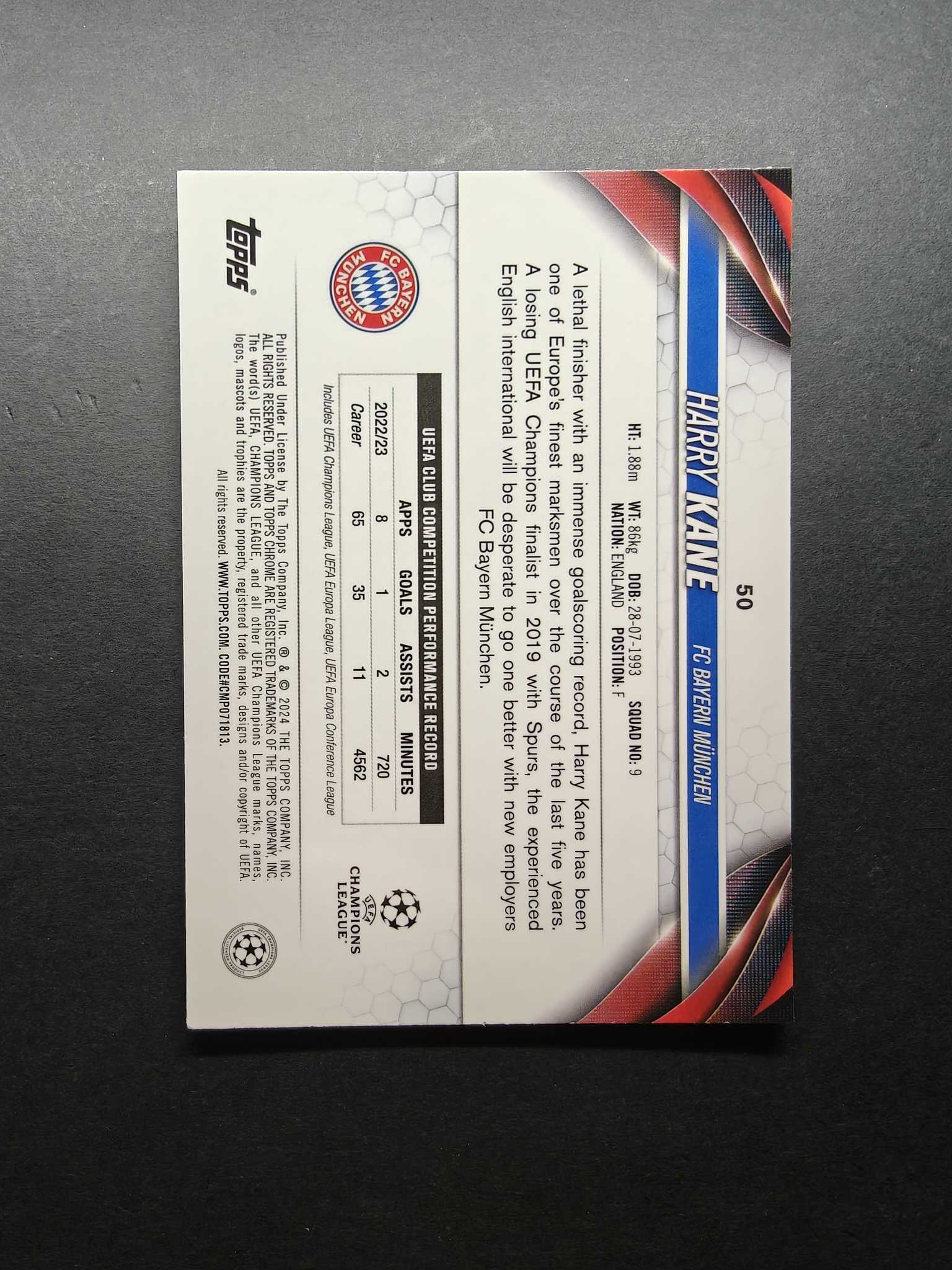 2024 Topps Chrome Harry Kane 哈里凯恩 粉棋盘折 60/99编 拜仁 热刺 英格兰 生涯首冠 英超 德甲射手王 默认微瑕 介意勿拍