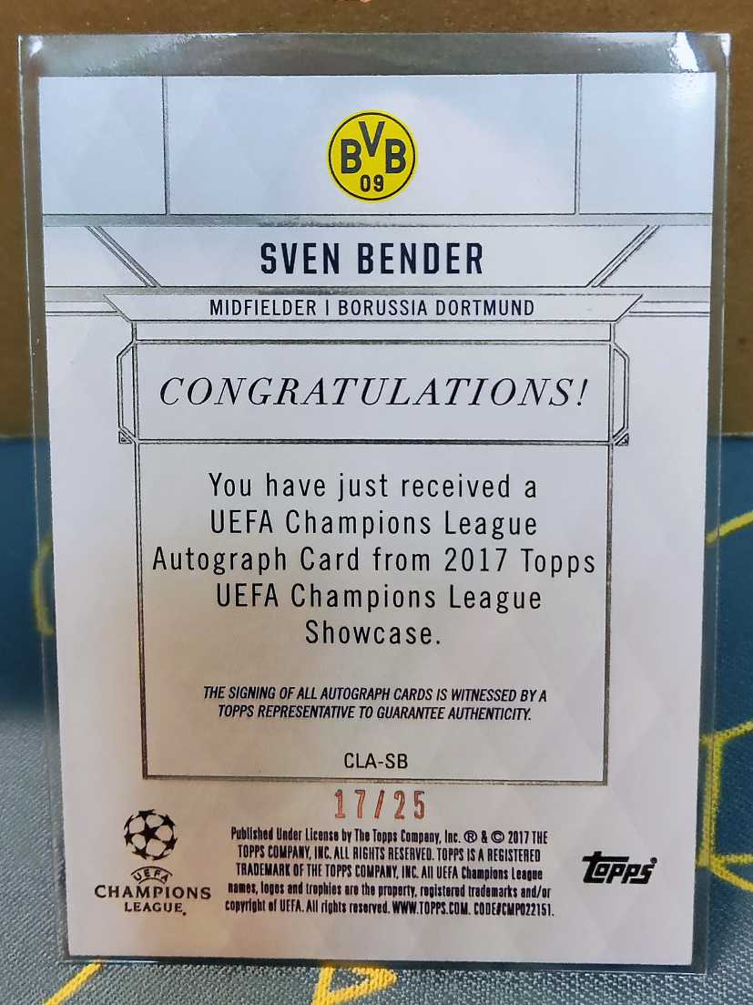2017 Topps UEFA Champions League 斯文·本德 Sven Bender Topps欧冠元年 超稀少25编低编粉折签字卡 多特蒙德名宿 德国队兄弟兵 签名墨迹完美 勒沃库森