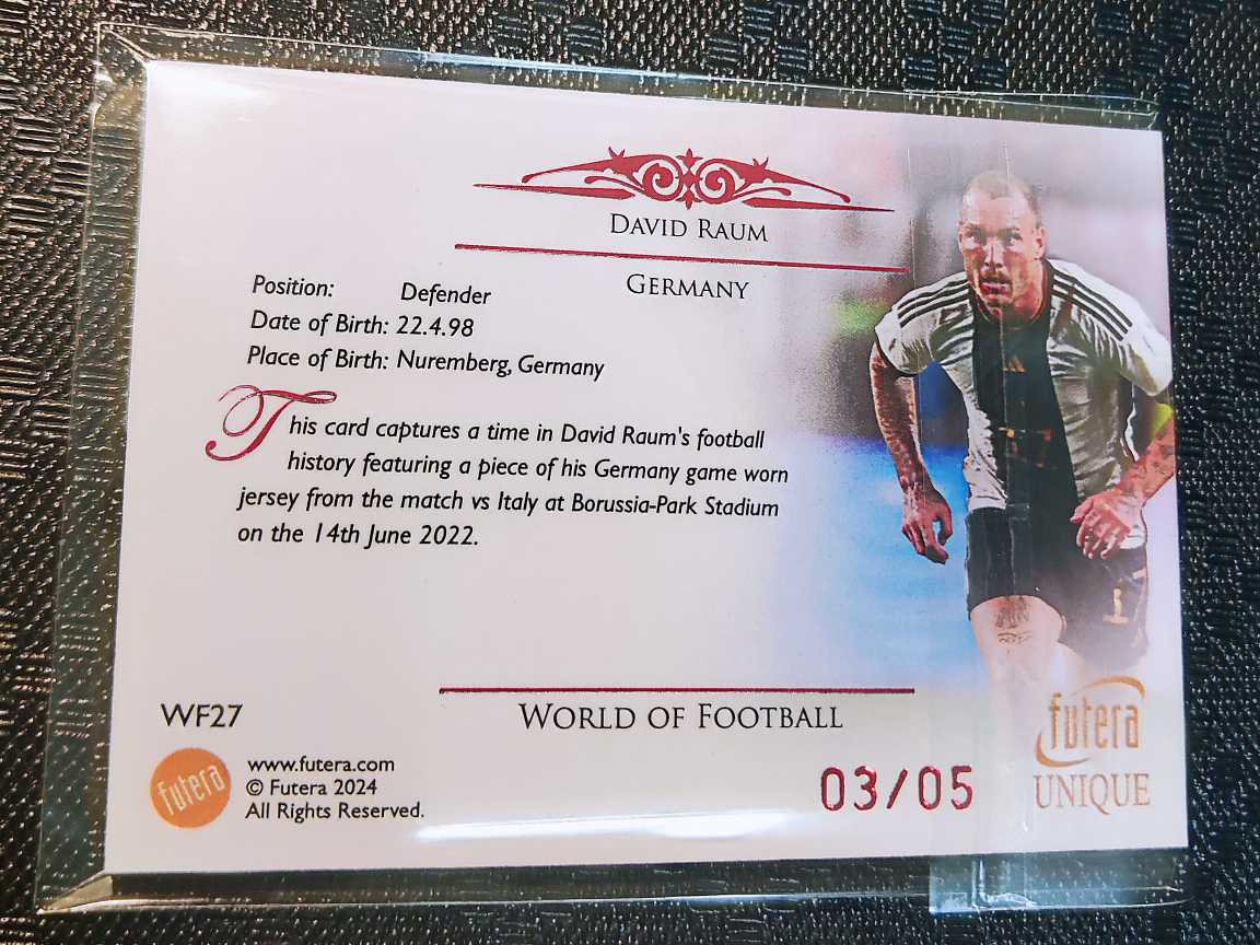 2024 Futera Futera Unique David Raum 【5编落场球衣卡】物料来自德国队对意大利队的欧国联比赛 莱比锡队长劳姆 福特拉超低编实物卡 德甲 霍芬海姆