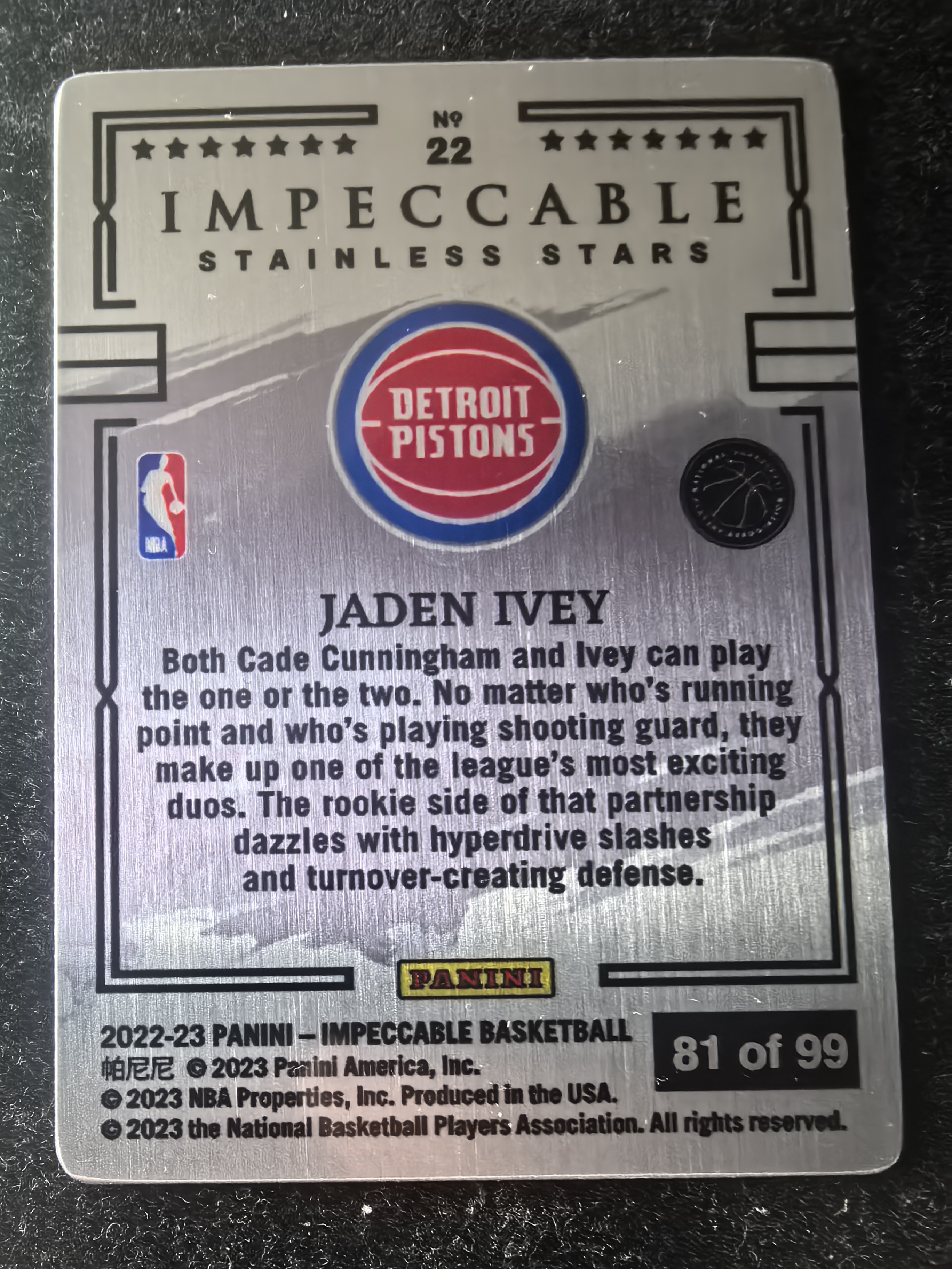 2022-23 Panini Impeccable Jaden Ivey RC 杰登 艾维 99编 小真金 铁板 活塞 新秀 RC 坎宁安 cc 奥萨尔 汤普森 队友