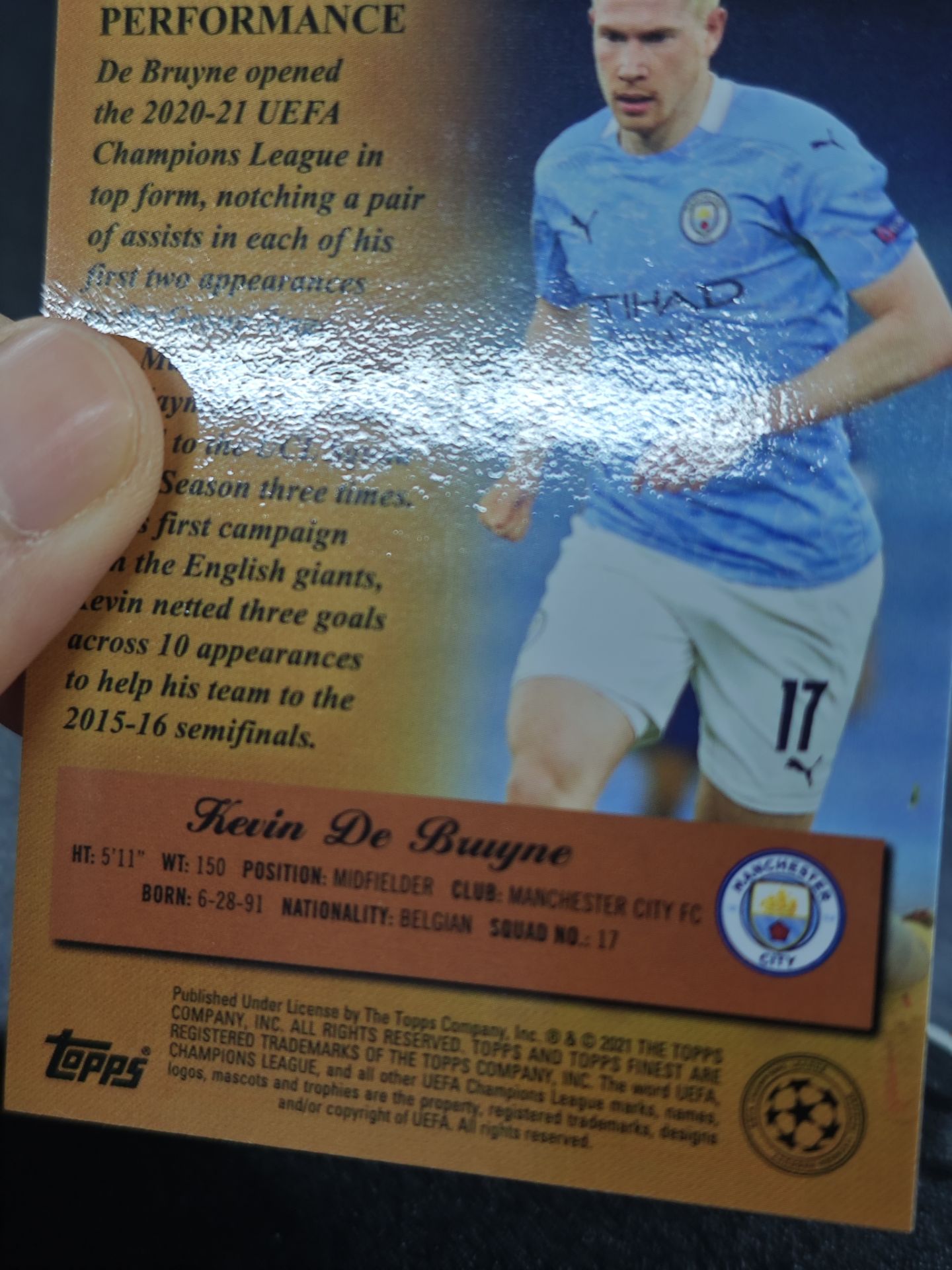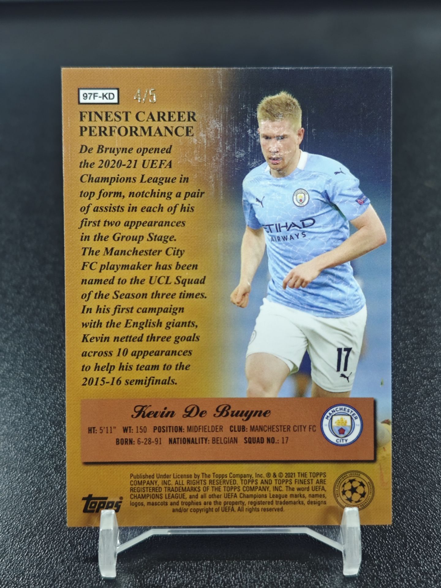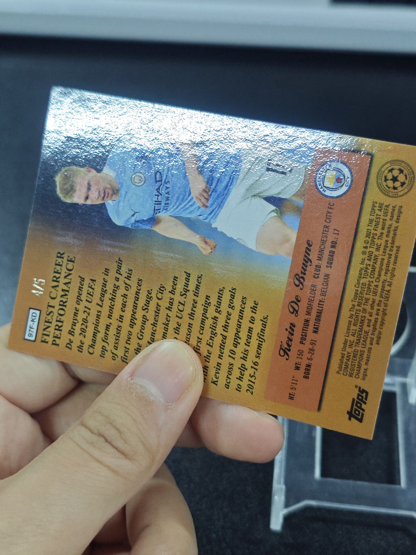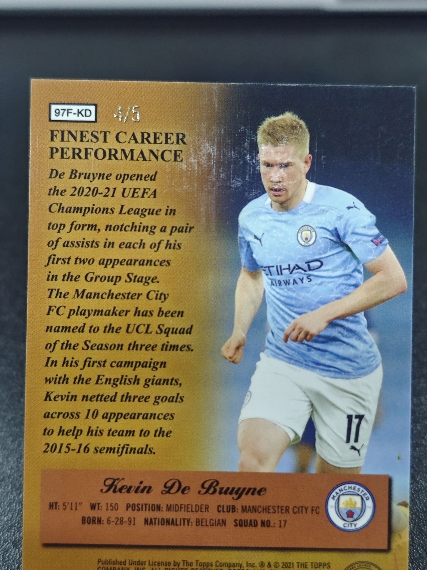 【浩行拍卖 截标预付82%】2021 topps finest Kevin De Bruyne 欧冠 曼城 凯文 德布劳内 4/5编 超低编 Masters 大师特卡 金折 折射 瑕疵看图 专收必备「心得」1024S01單