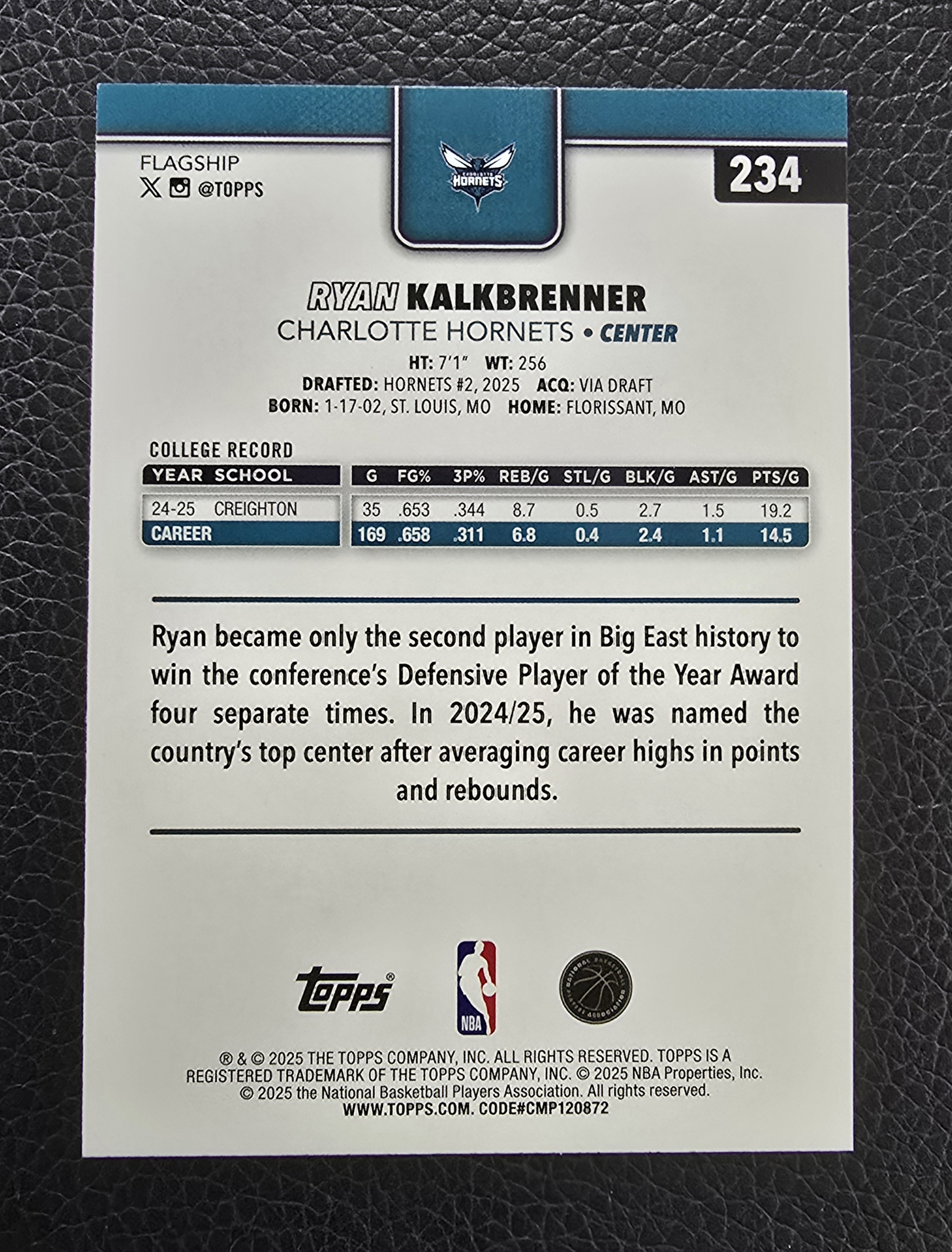 2025 Topps Jumbo Ryan Kalkbrenner RC 【小草卡店】黄蜂新秀 瑞安·卡尔克布伦纳 银点折 迪斯科折 已坐稳主力 效率之王 联盟第一命中率 新秀最强中锋