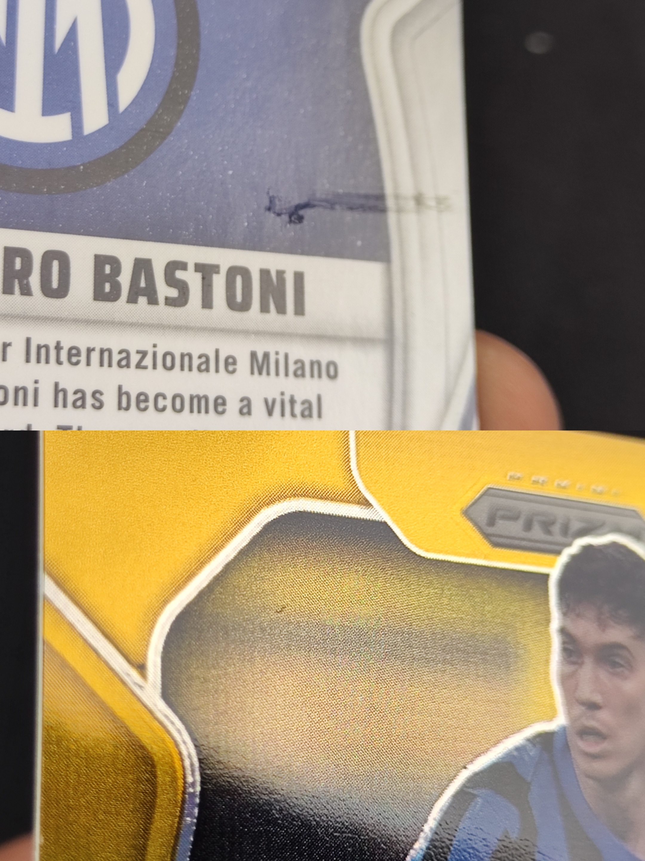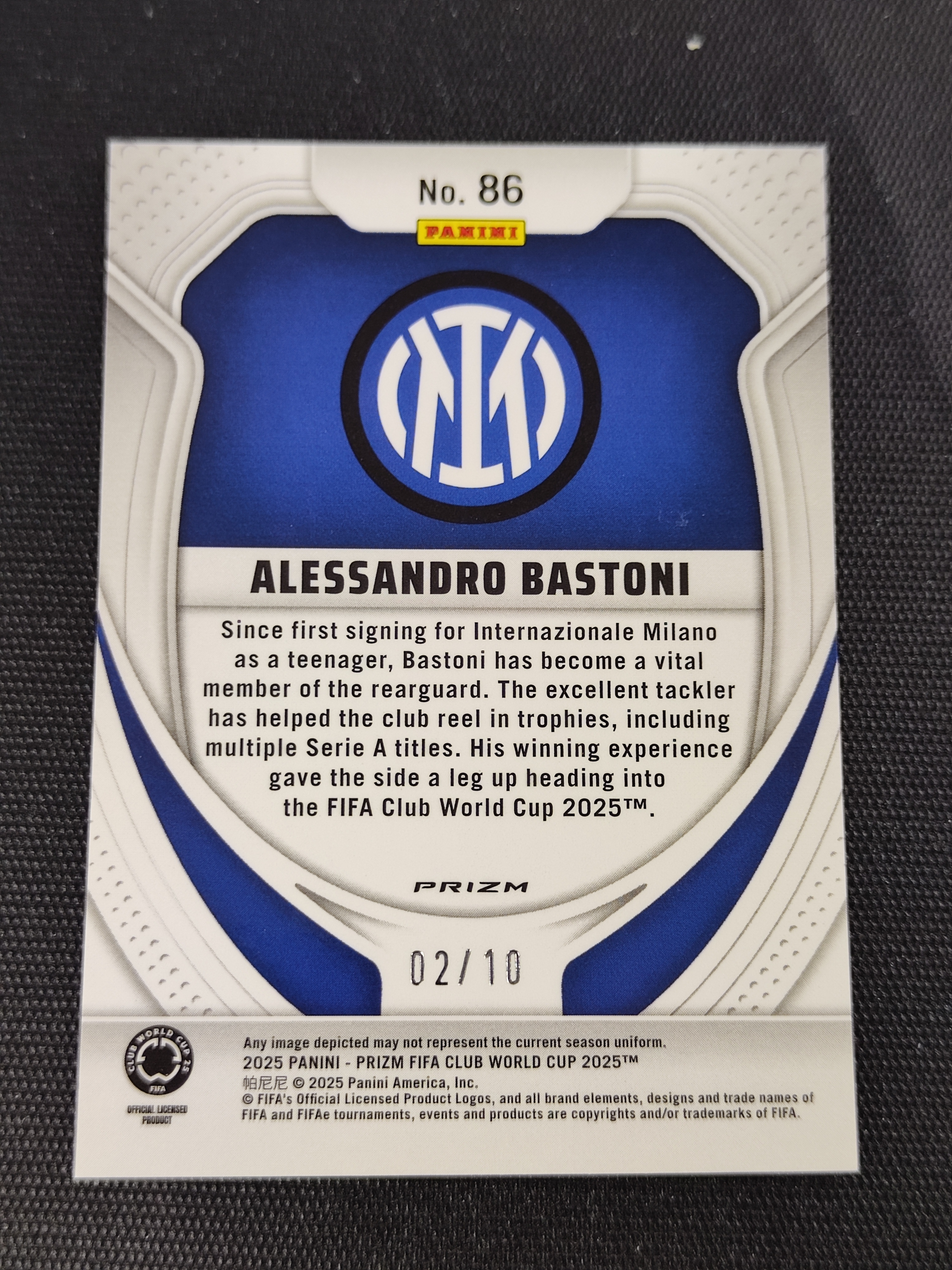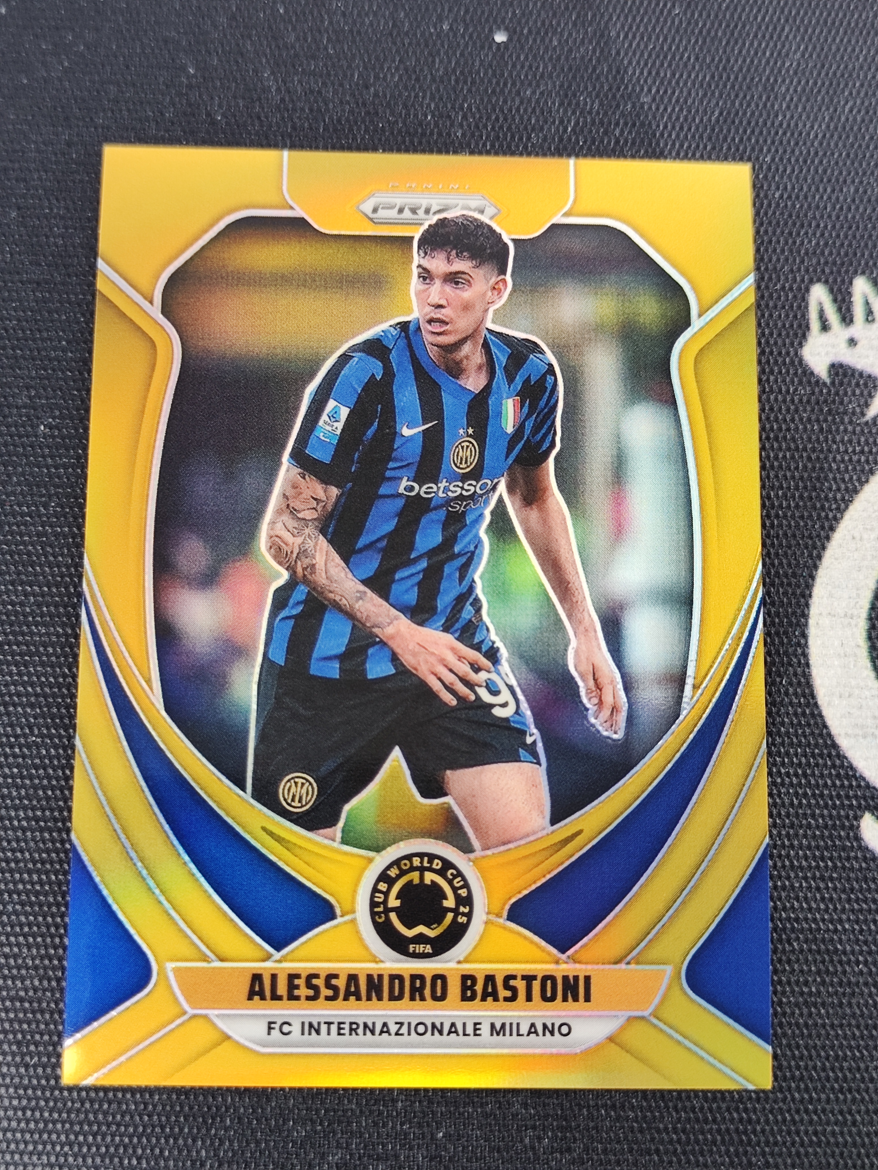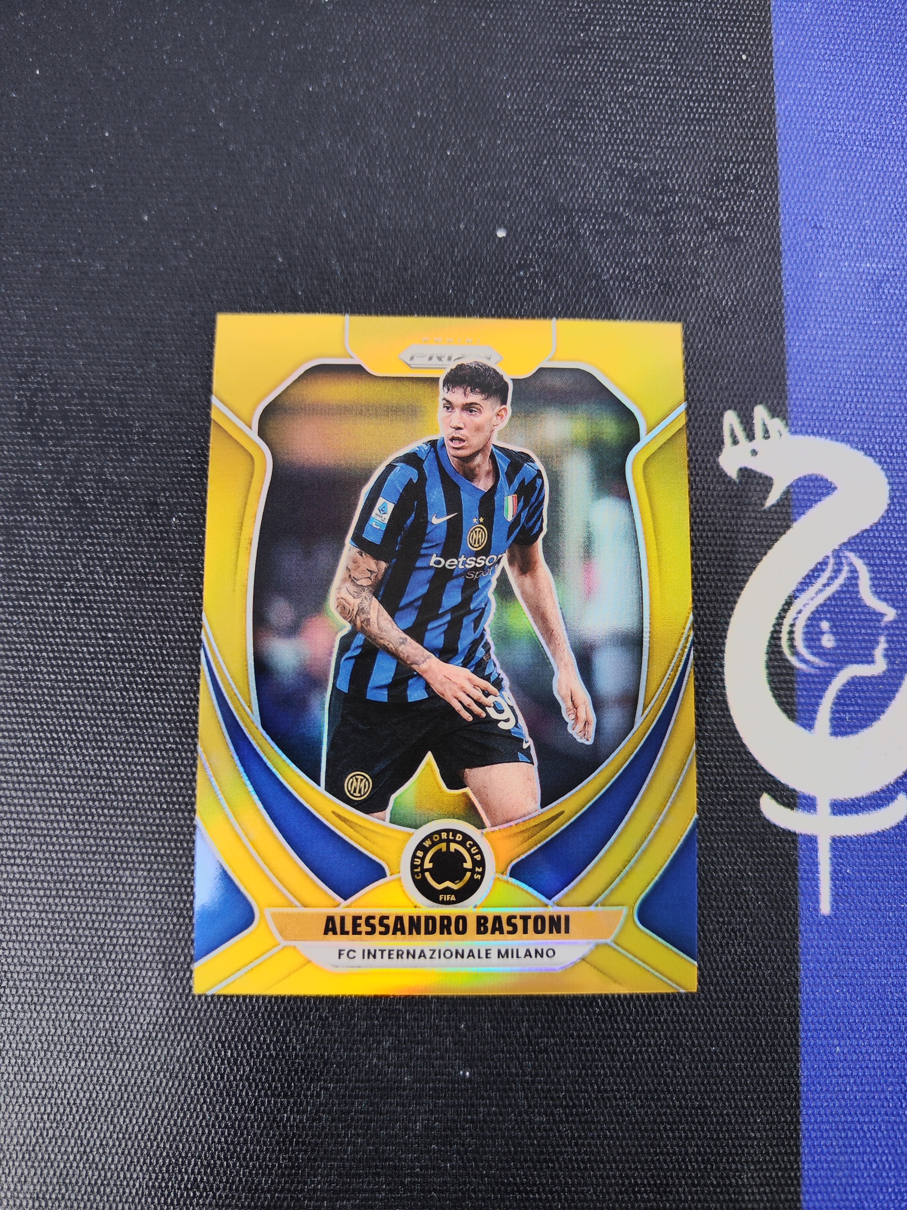 2025 Panini Prizm Alessandro Bastoni 【蓝黑精灵卡社】世俱杯Prizm PZ 国际米兰 意大利 后卫 巴斯托尼 02/10编 金折 收藏必备 微瑕如图 仙林落日