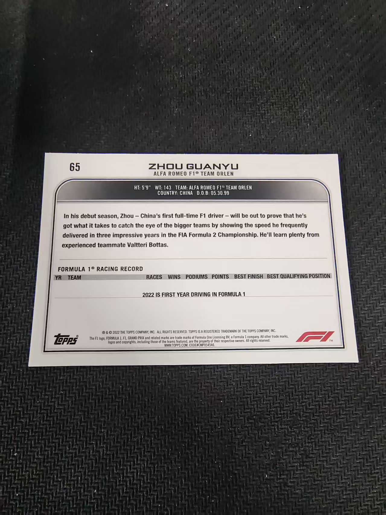 【汽水拍卖】2022 Topps Chrome F1 Guanyu Zhou 国人骄傲 周冠宇 RC 新秀 黑白棋盘 划痕 边角瑕疵 #65