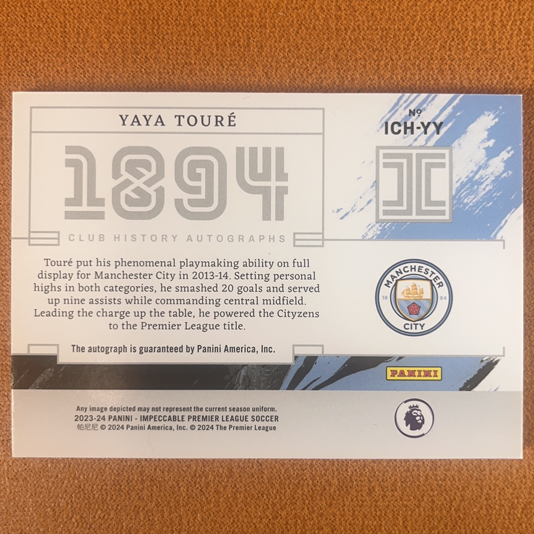 2023-24 Panini Impeccable YAYA TOURE 亚亚图雷 签字 卡签 40/94编 俱乐部历史签 单一平行 曼城 巴萨 巴塞罗那 科特迪瓦 英超 小真金 带砖发