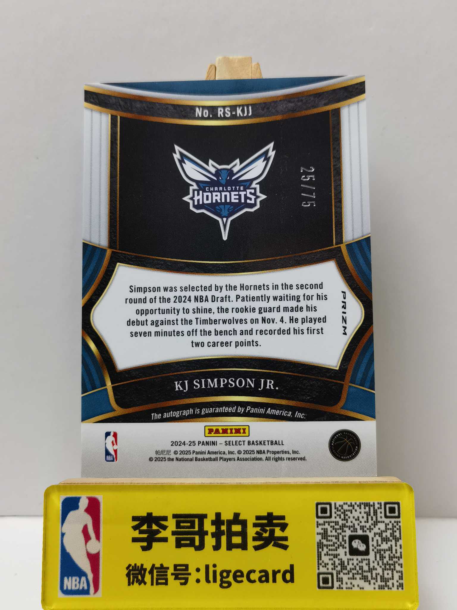 2024-25 Panini Select KJ Simpson 【李哥代卖】KJ辛普森 75编 RC新秀 贴签签字 黄蜂 红尘大飞1115