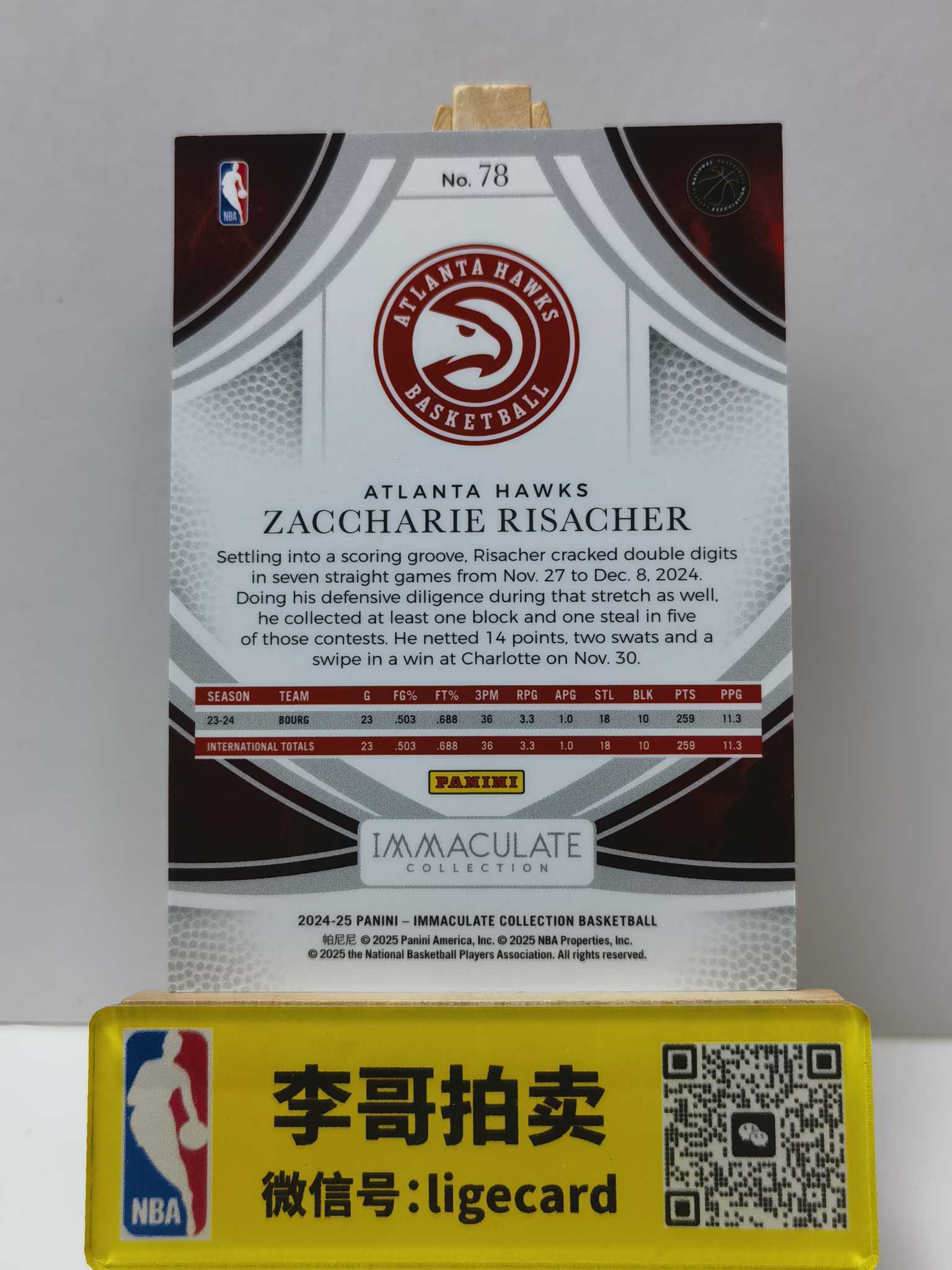 2024-25 Panini Immaculate Zaccharie Risacher 【李哥代卖】爱咪咪 扎卡里里萨谢 49编 RC新秀 老鹰 show1116