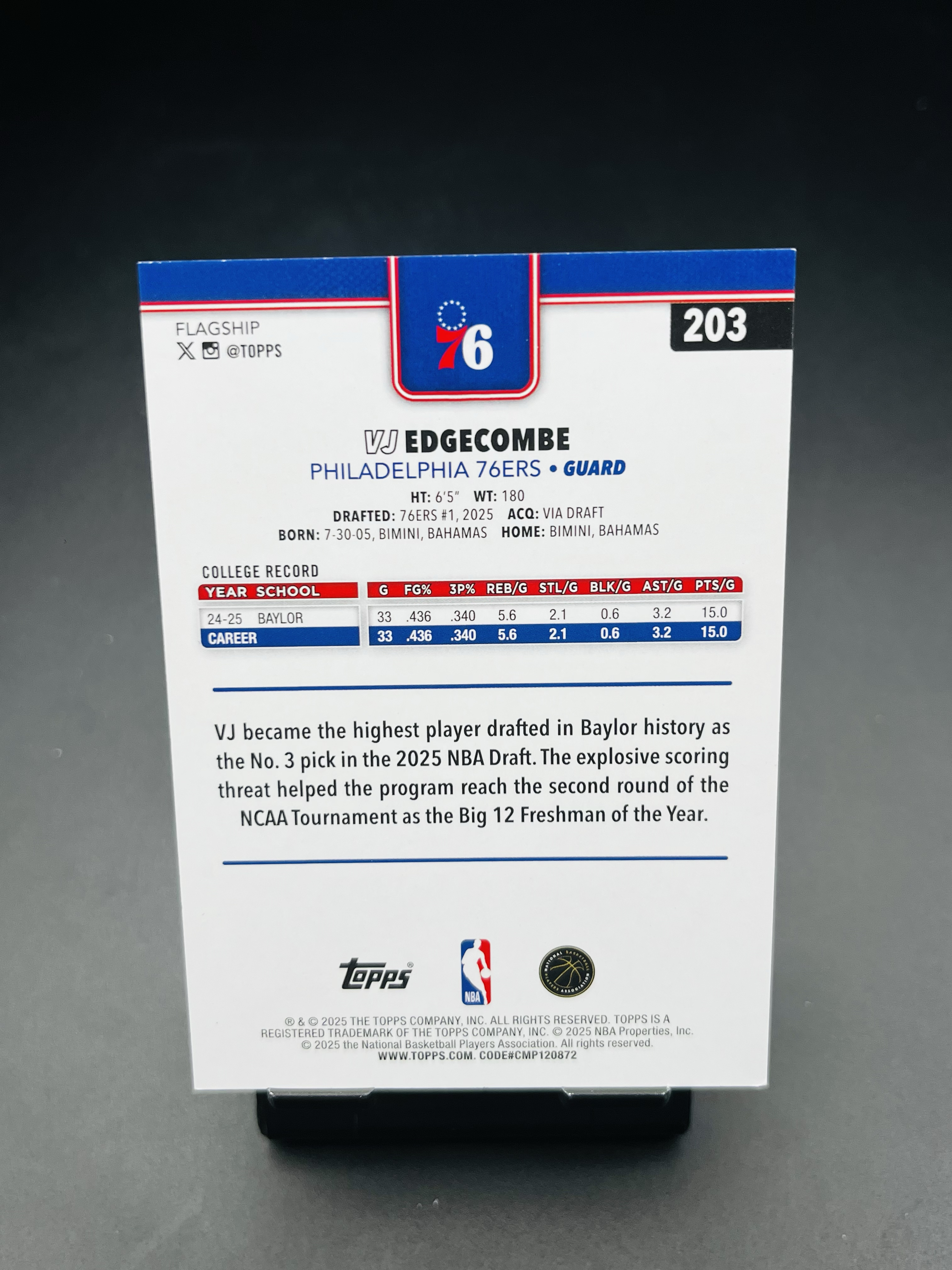 2025-26 Topps Basketball Valdez VJ Edgecombe Jr RC 76人 新秀 VJ 埃奇库姆 07/68编 黑折 正base 未来可期 【鸟叔拍卖】牛马