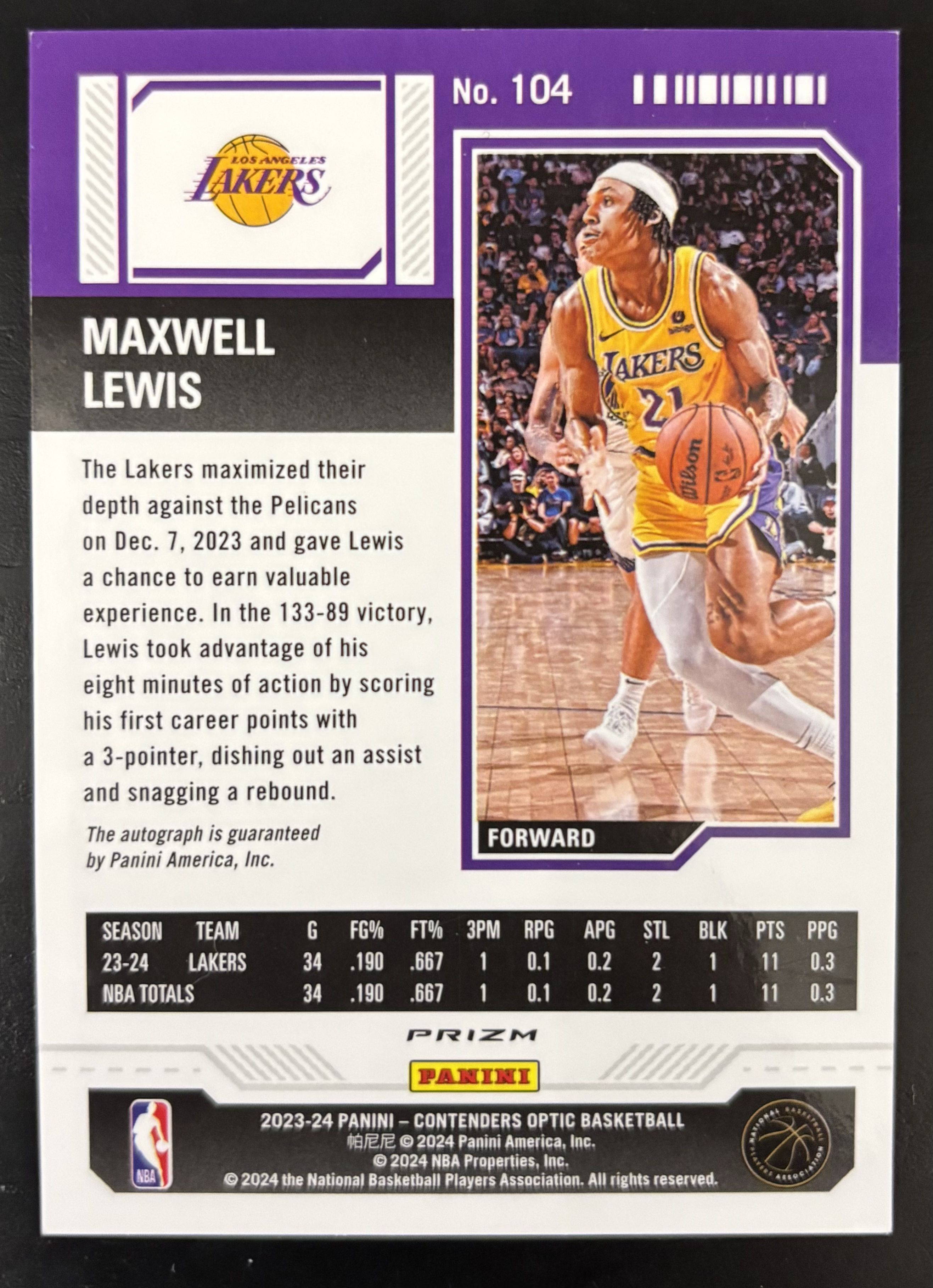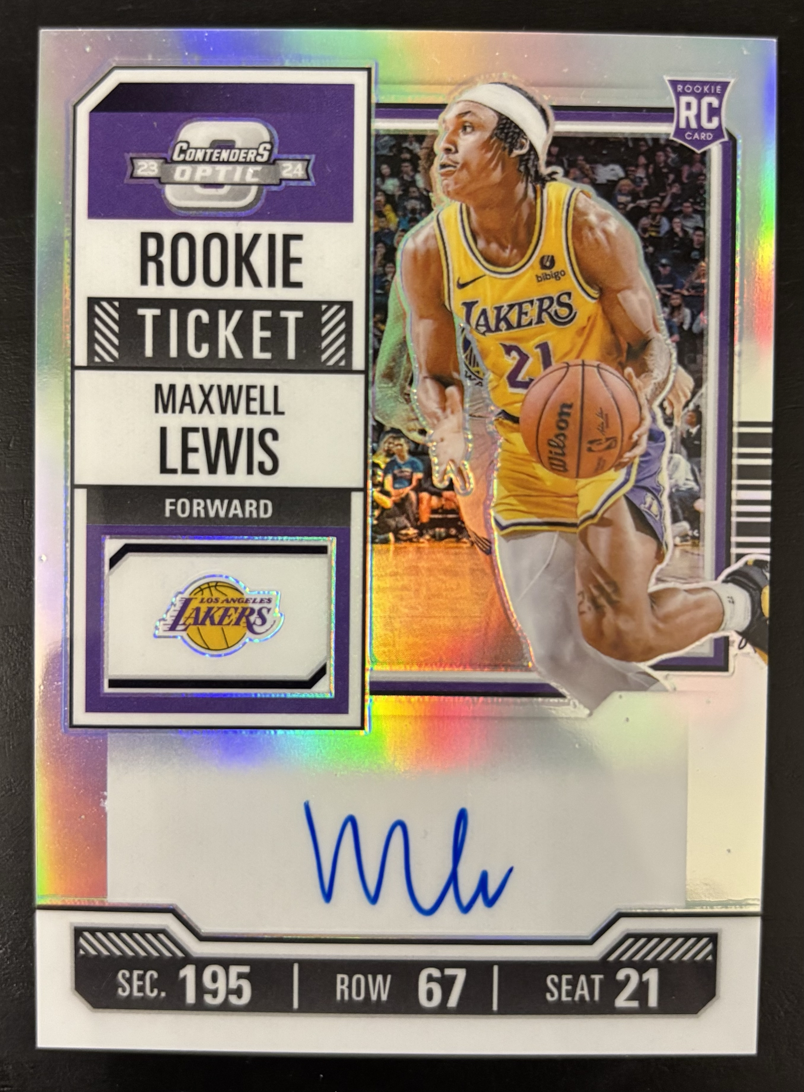 2023-24 PANINI CONTENDERS OPTIC 球票系列湖人新秀RC 马克斯韦尔刘易斯 签字卡 卡签正新秀球票签字卡银折 折射备
