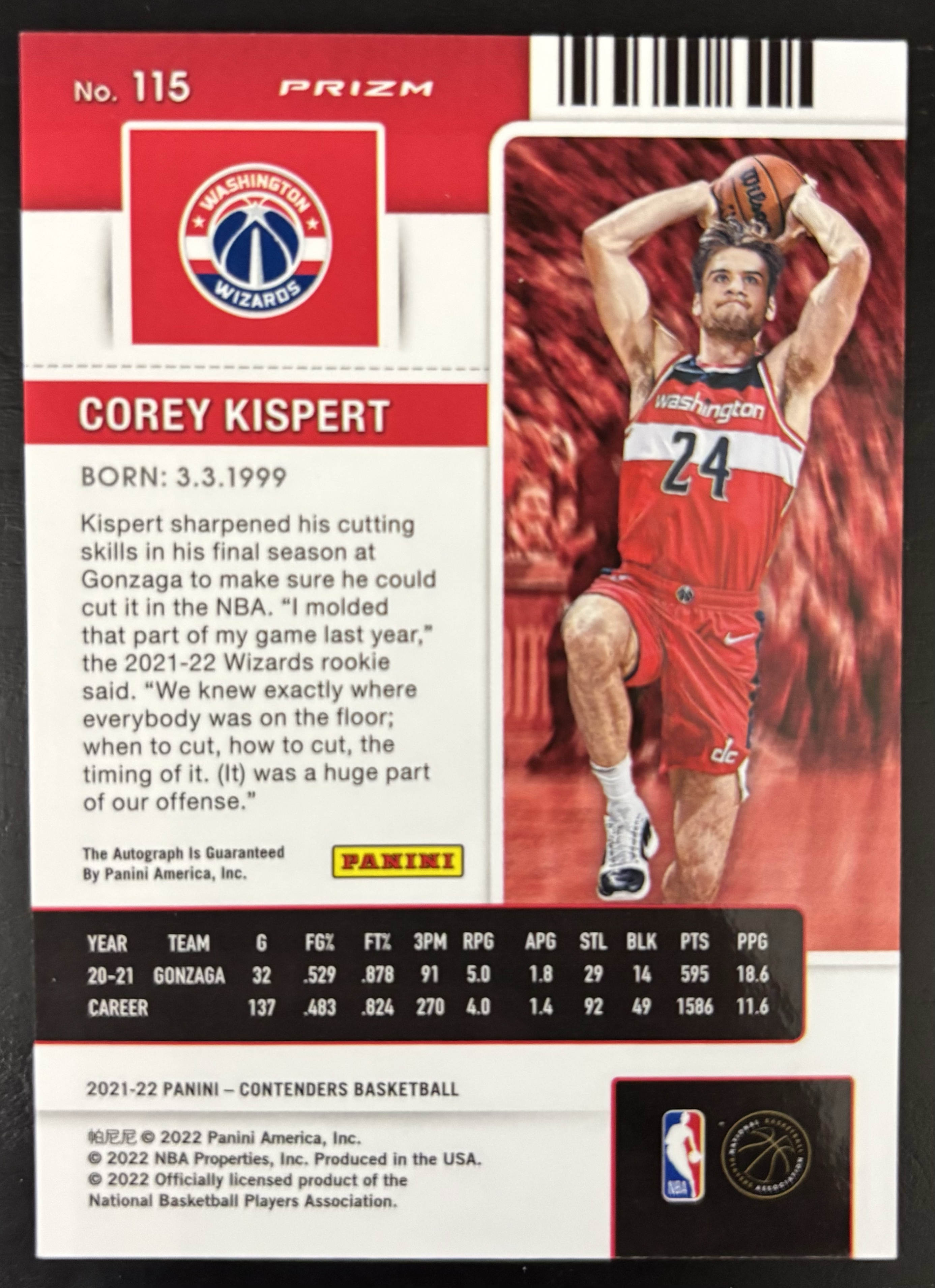 2021-22 PANINI CONTENDERS 球票系列 奇才新秀RC科里基斯伯特签字卡卡签正新秀球票签字卡银折折射专收凑套必备