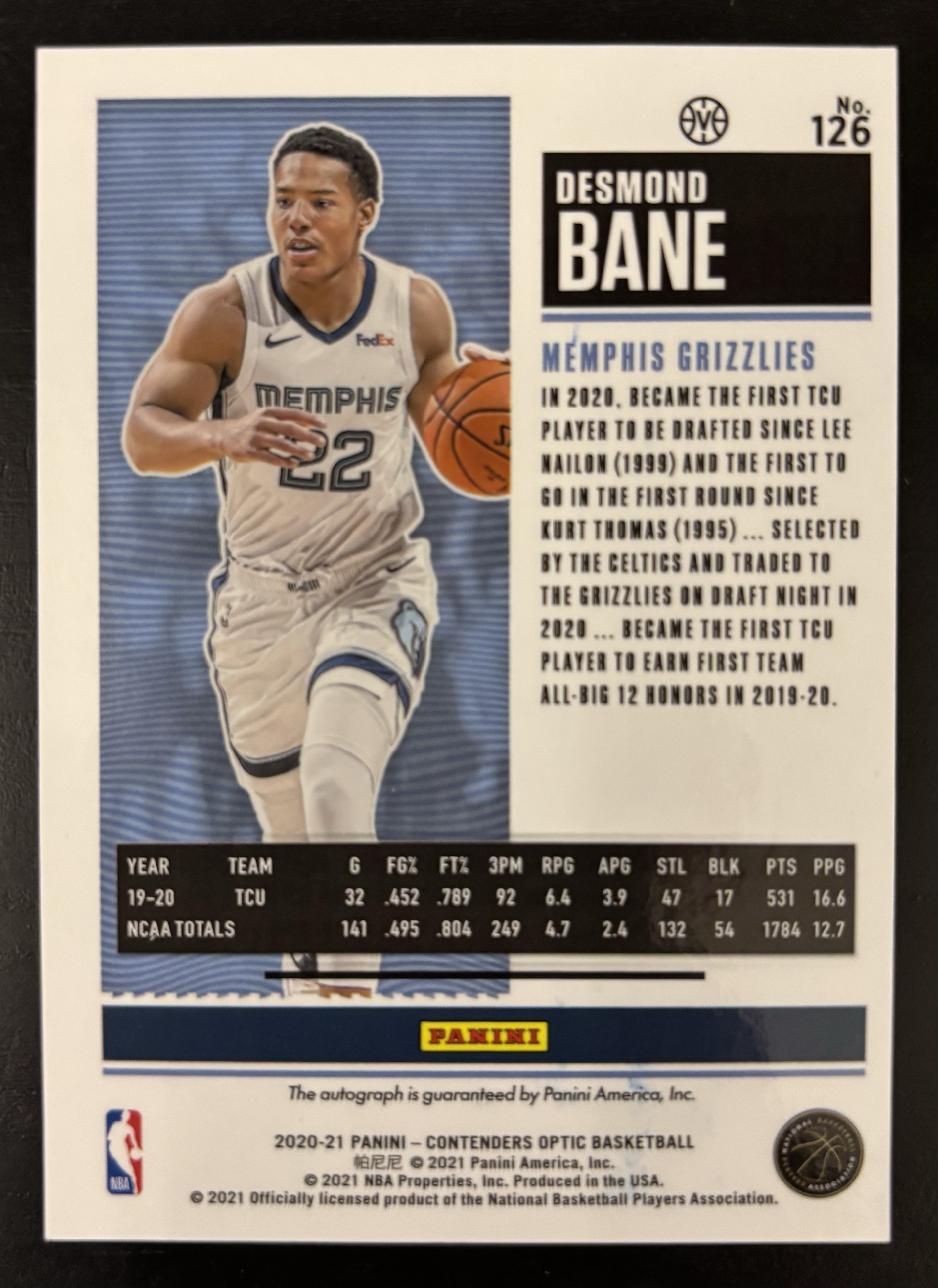 2020-21 Panini Contenders Desmond Bane RC 德斯蒙德 贝恩 球票 卡签 顶级潜力变化版新秀 银折 收藏必备 灰熊 魔术 班凯罗 瓦格纳 莫兰特 JJJ 队友