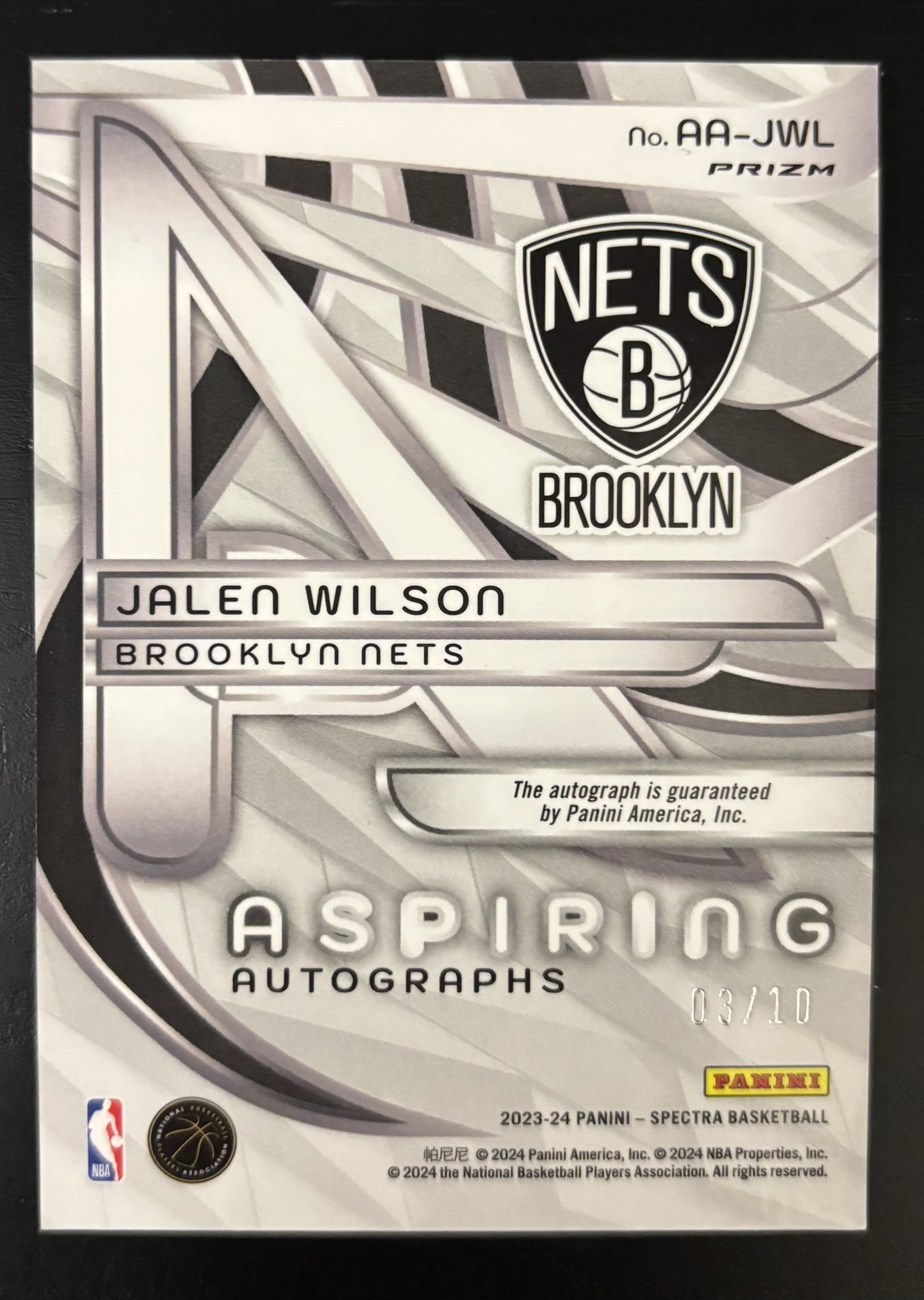 2023-24 Spectra 光谱 Jalen Wilson杰伦 威尔逊篮网 RC 新秀 黑折银笔签签字Aspiring特卡03/10编 大热新秀 值得收藏 潜力无限