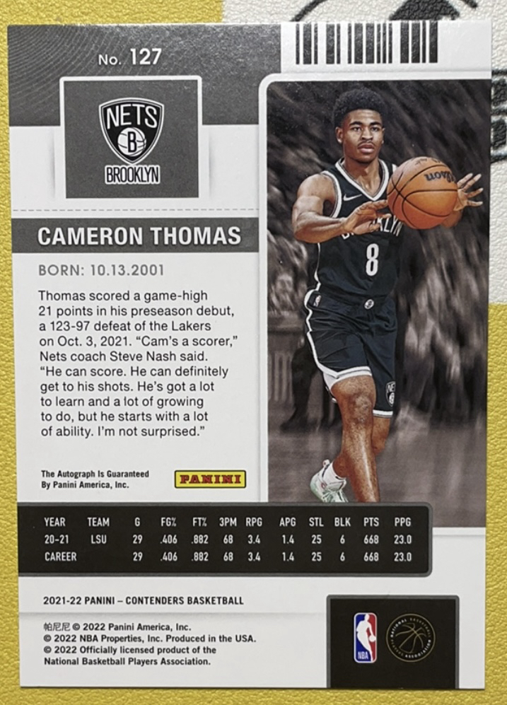 2021-22 Panini Contenders Cameron Thomas RC 球票 篮网 卡梅隆 卡梅伦 托马斯 新秀 签字 卡签 轻印如图