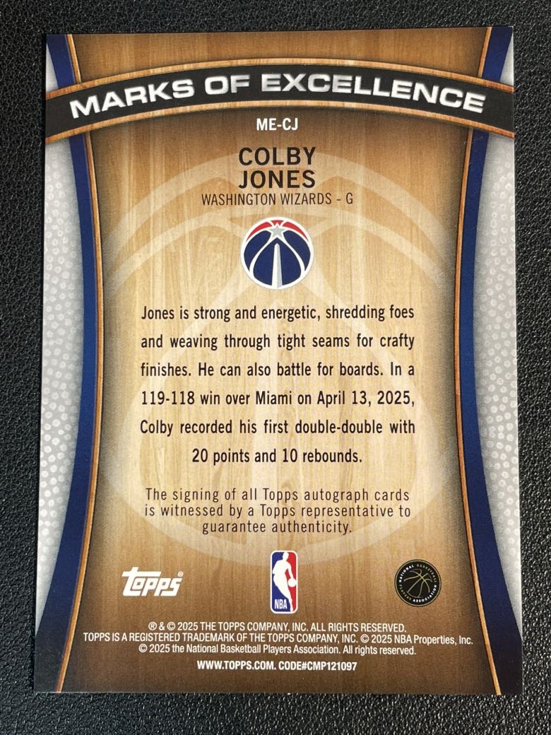 2025 Topps NBA Flagship Colby Jones 3 考尔比 琼斯 奇才 签字 卓越标志签 微瑕如图 卡品如图 尖叫代拍 Bzz