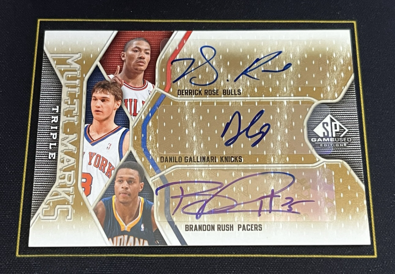 2009-10 upper deck sp game used 德里克 罗斯 加里纳利 布兰登 拉什 三人 签字 67/75编 公牛 尼克斯 步行者 专收必备