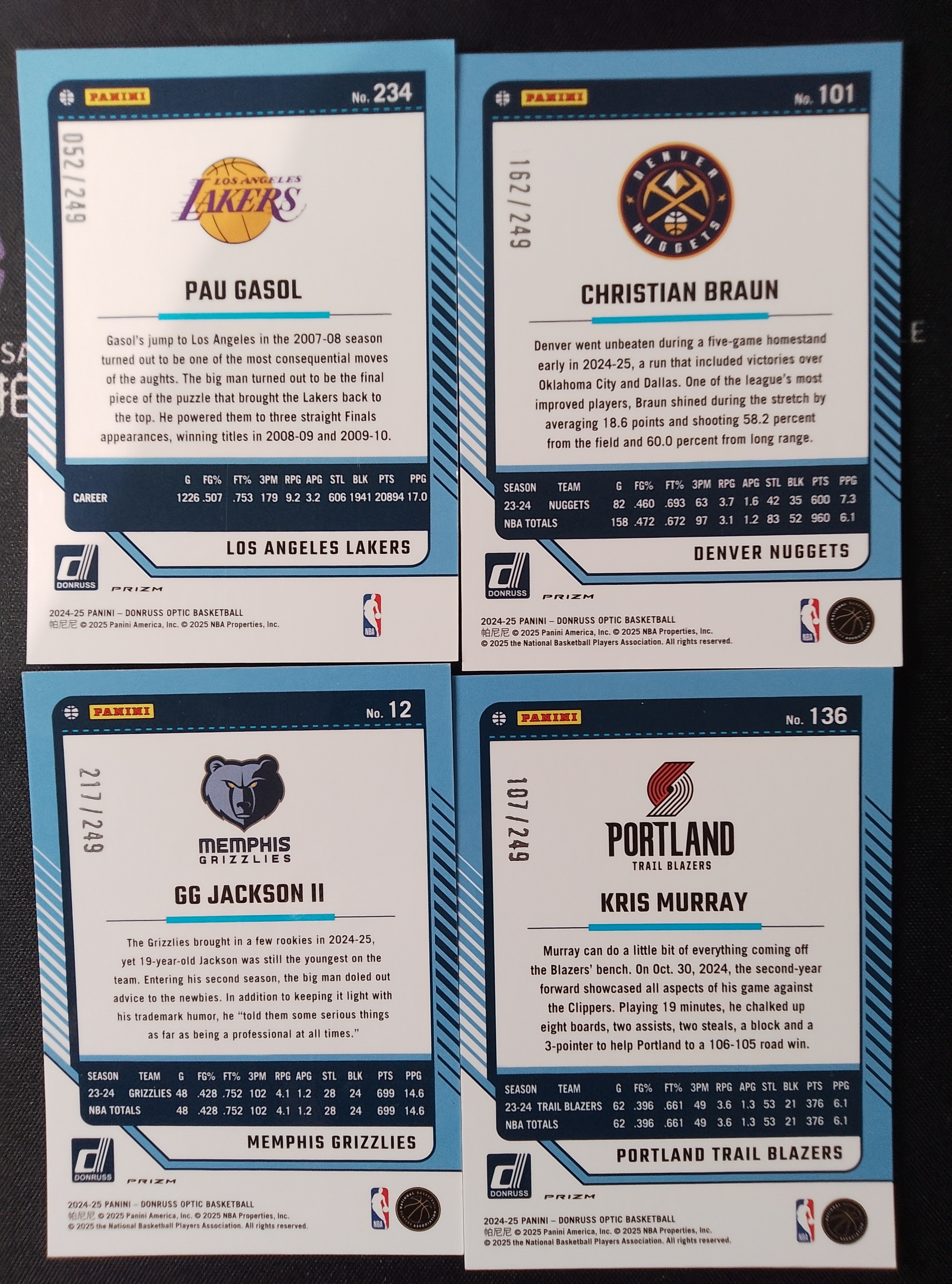 4.品相说明:(1)木盒、国宝、IMM、手提、NOIR、小书、金书、小真金、黑曜石、Encased等厚卡或老卡老系列均有正常白边白角,Prizm、Optic、Select、Flux、Chrome等折射系列薄卡有小划痕、小印记或非人为卡片制作印刷的问题属于正常通行品,镜面系列有小划痕属于通行品相。所有卡片不保证金标,要评级追求金标者请直接购买金标,请有强迫症、品相控的卡迷绕道和谨慎出价;(2)原封卡有明显大瑕疵会标出;(3)所有拍品均为实图专业设备拍摄,参与竞价视为接受卡片的品相,不作特殊说明的都是通行品,如有明显大瑕疵会拍照说明;(4)由于拍摄卡片的角度以及光线的限制,若您对卡片品相仍存在疑问,可在【截标前】向卖家咨询提供更多细节图。