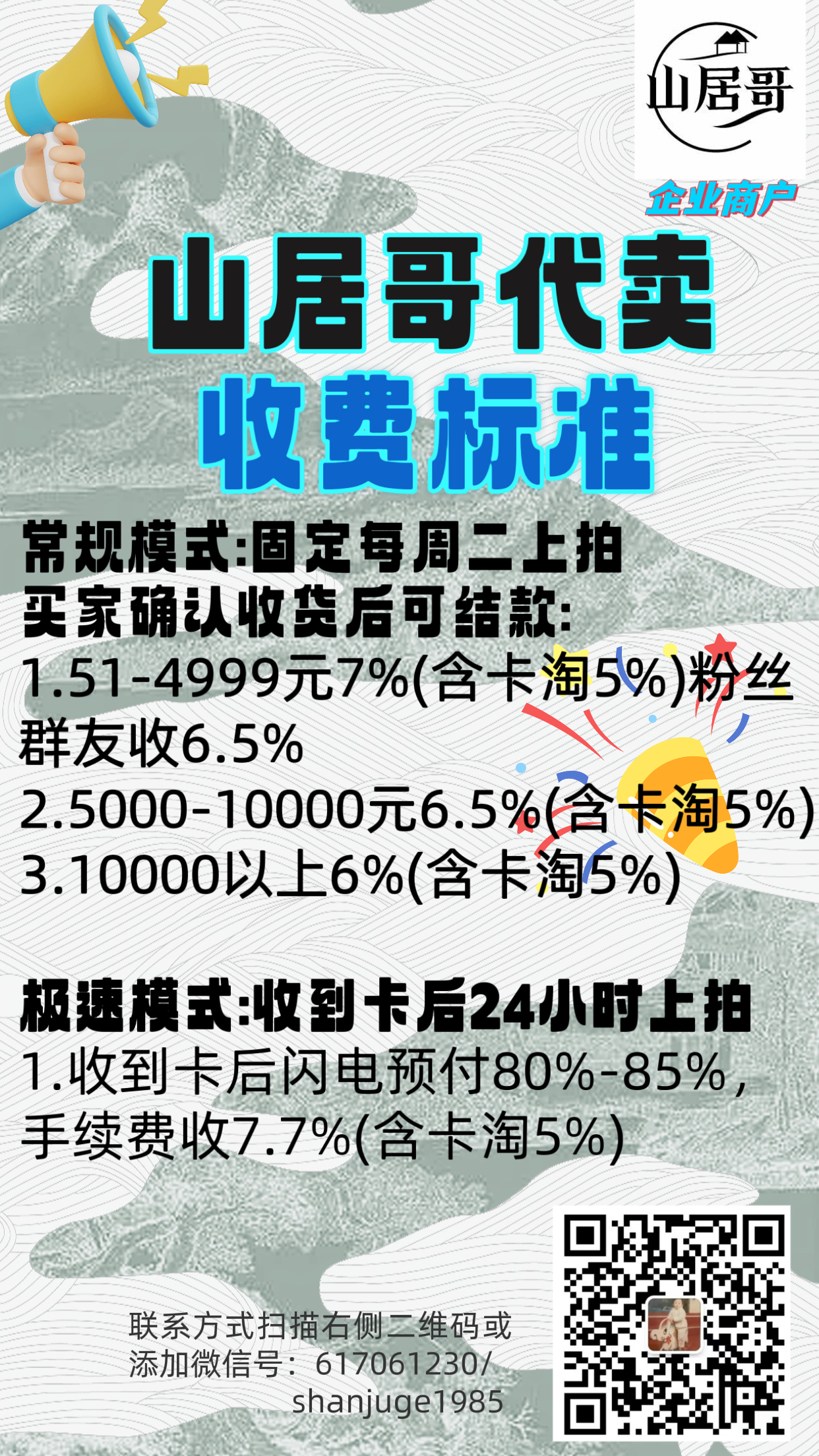 本卡片为个人寄售商品!!!【山居哥代卖】承接代卖 请阅读后竞价 大额预付85%-90%!卡到预付!截标预付!闪电回款! 微信:617061230 1.本店企业商户,线上支付,直接付款给平台!付款后一定站内信留言!   2.为了卡片安全,只发顺丰陆运,超过1000元建议顺丰到付实价保价,如因未保价快递中有任何问题导致卡品受损遗失等买家联系快递处理赔付,本店也会协助您处理相关问题,一律发陆运,如需发空运站内信留言即可。一般一周发两次货,会根据付款顺序3日内发出。   3.卡品如图,一般通行品以上,如无说明则为通行品,如有瑕疵会提供文字说明。国宝imm等系列厚卡,老卡有白边白角属于正常卡品,镜面卡签有小划痕属于正常通行品相,评级卡砖上的划痕破损不属于品相问题,一定把拍卖图片看清,折射系列不保证金标,要评级追求金标者请直接购买金标。拍后请于3日内付款,5日内不付款将直接申请投诉封号.   4.需要改地址的请付款前在订单里改好,只发默认地址。   5.重要的事情说三遍:本店不支持累计,本店不支持累计,本店不支持累计,不接受任何转让转拍合并发货的卡,买家若转让可将卡发回后自行处理。卡淘留言看到后会第一时间给您回复。联系方式:wx617061230