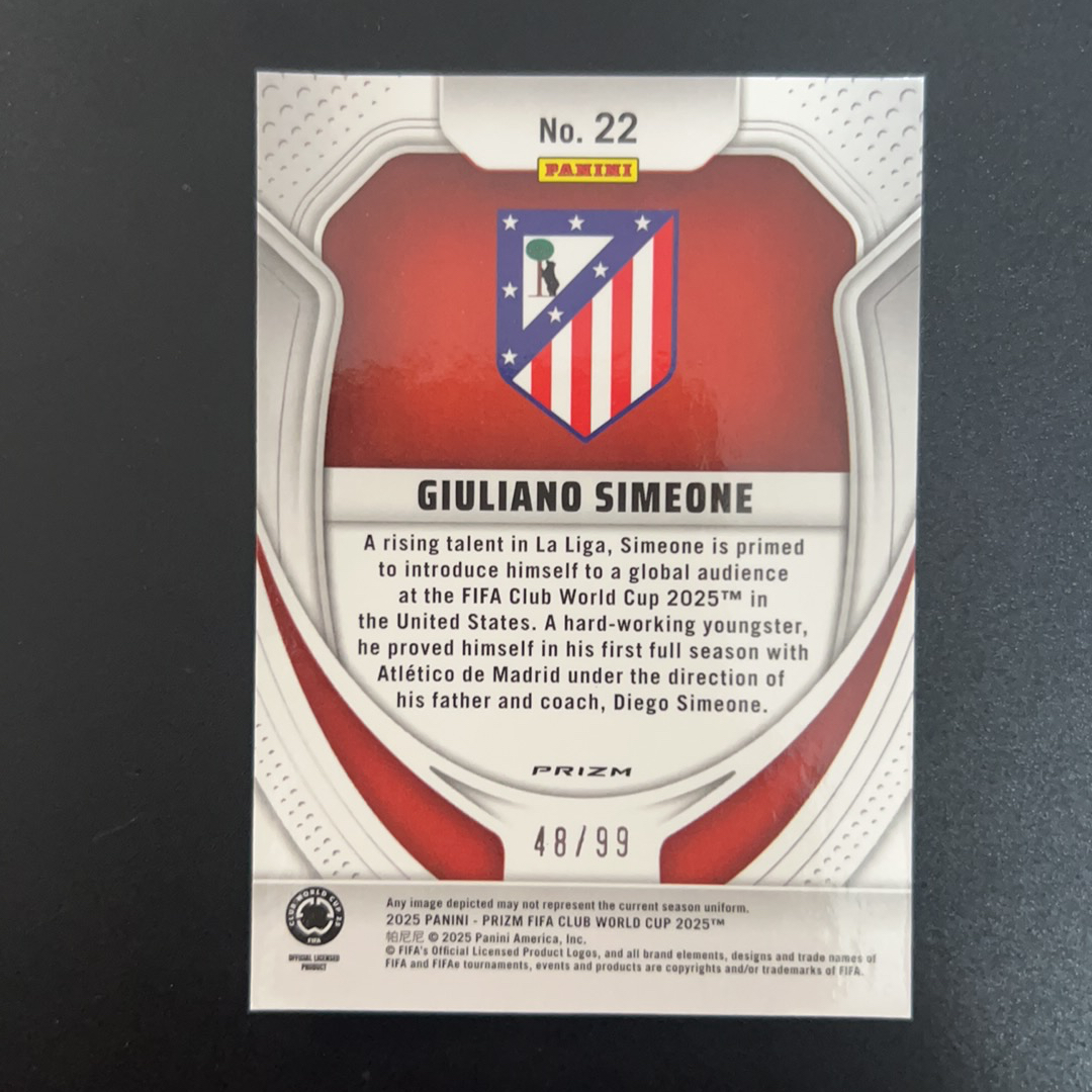 2025 Panini Prizm Giuliano Simeone RC 世俱杯PZ 马德里竞技 马竞 朱利亚诺 西蒙尼 新秀 青折 48/99编 收藏必备 卡品如图