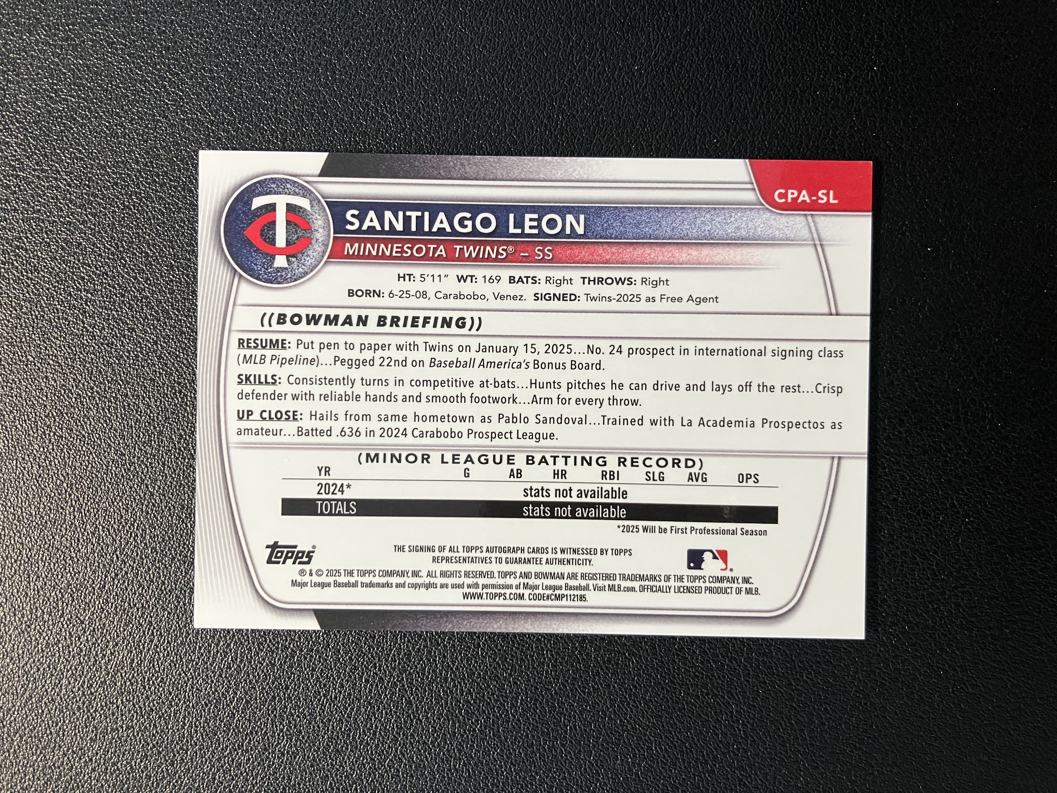 2025 Topps Bowman Chrome Santiago Leon 圣地亚哥-莱昂 里昂 单人签字 卡签 1st 明尼苏达双城 卡品如图 B227